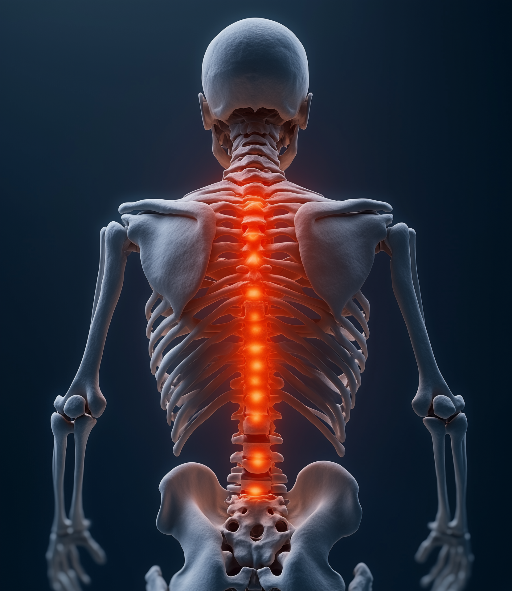 This illustration features a human skeleton highlighted in red at the spine area, emphasizing the location of back pain. The dark blue background contrasts beautifully with the detailed depiction of the skeleton, creating a striking visual effect.
