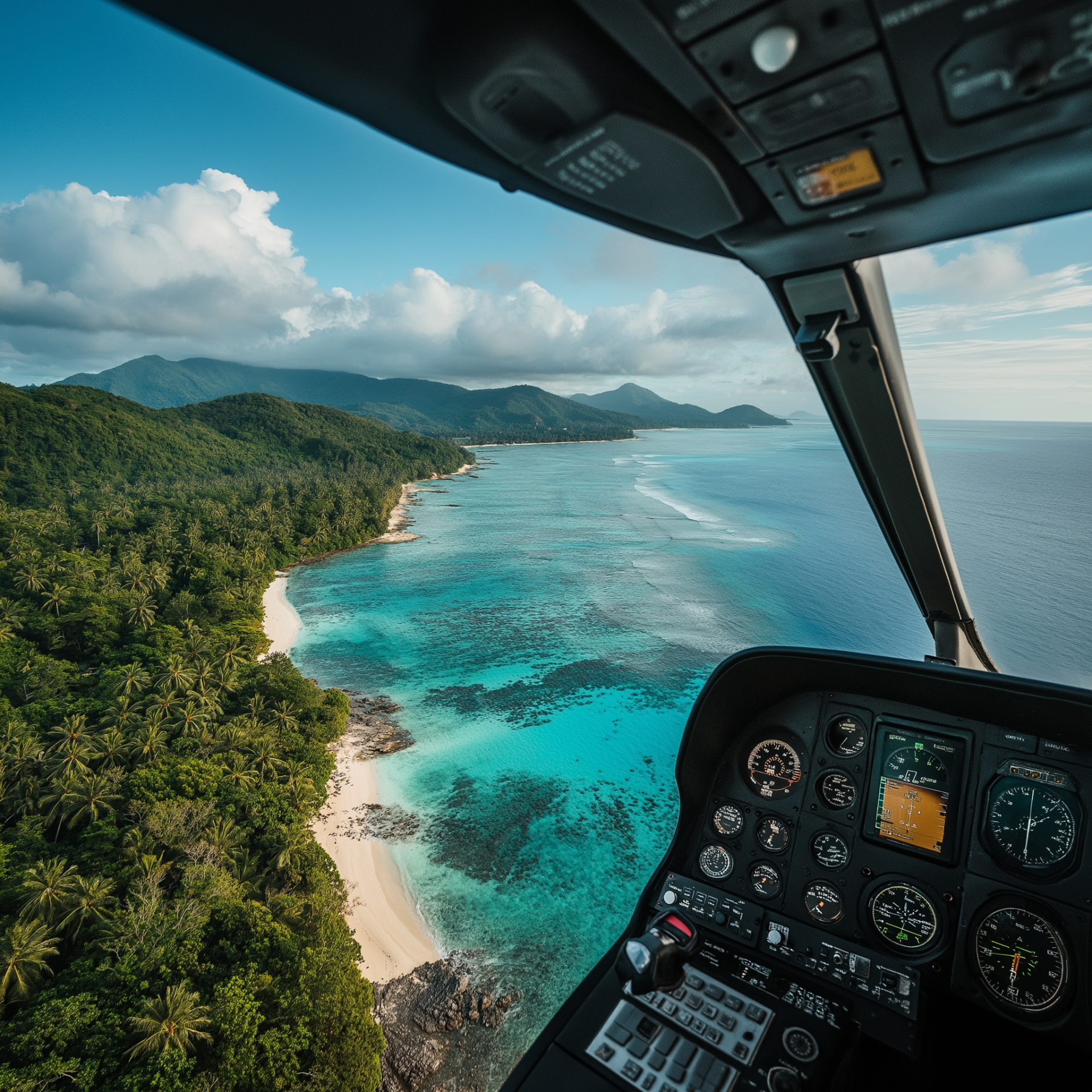 The image captures a breathtaking view of a tropical coastline from the cockpit of a helicopter. Vibrant turquoise waters stretch out below, framed by lush greenery and sandy beaches under a clear blue sky.
