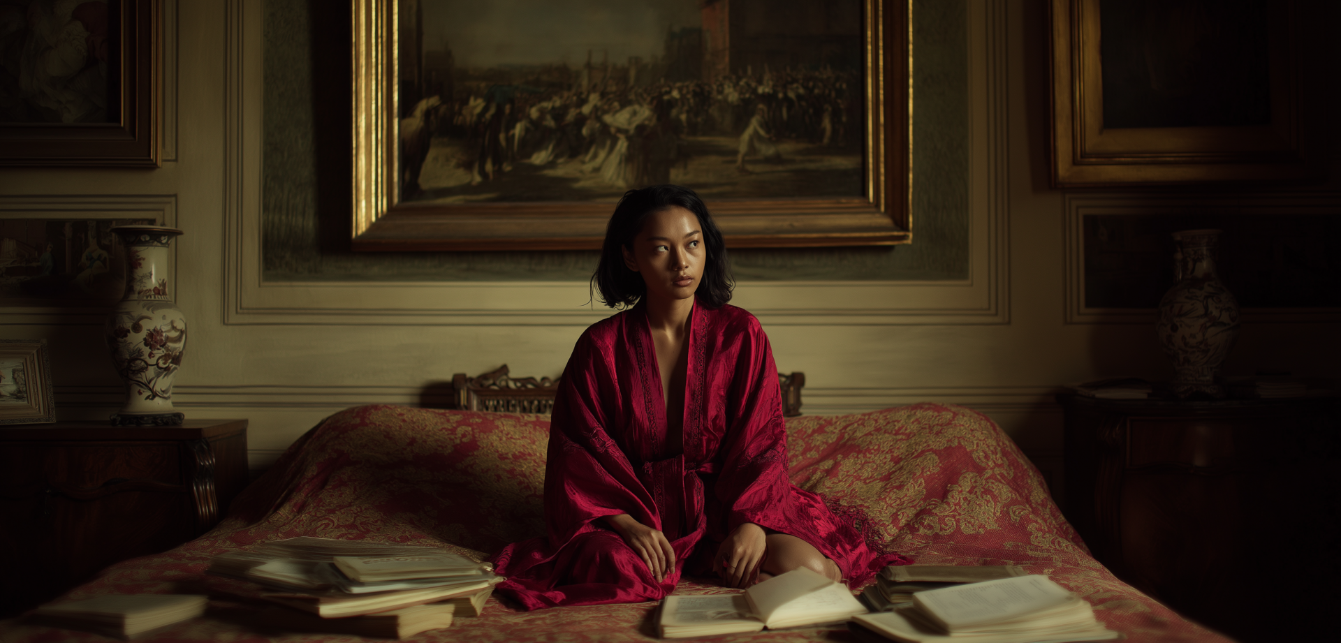 The image captures a rich woman dressed in luxurious red robes, sitting thoughtfully on her bed. The surrounding ambiance is filled with scattered books and scrolls, while classical paintings adorn the walls, creating a rich and historical atmosphere.