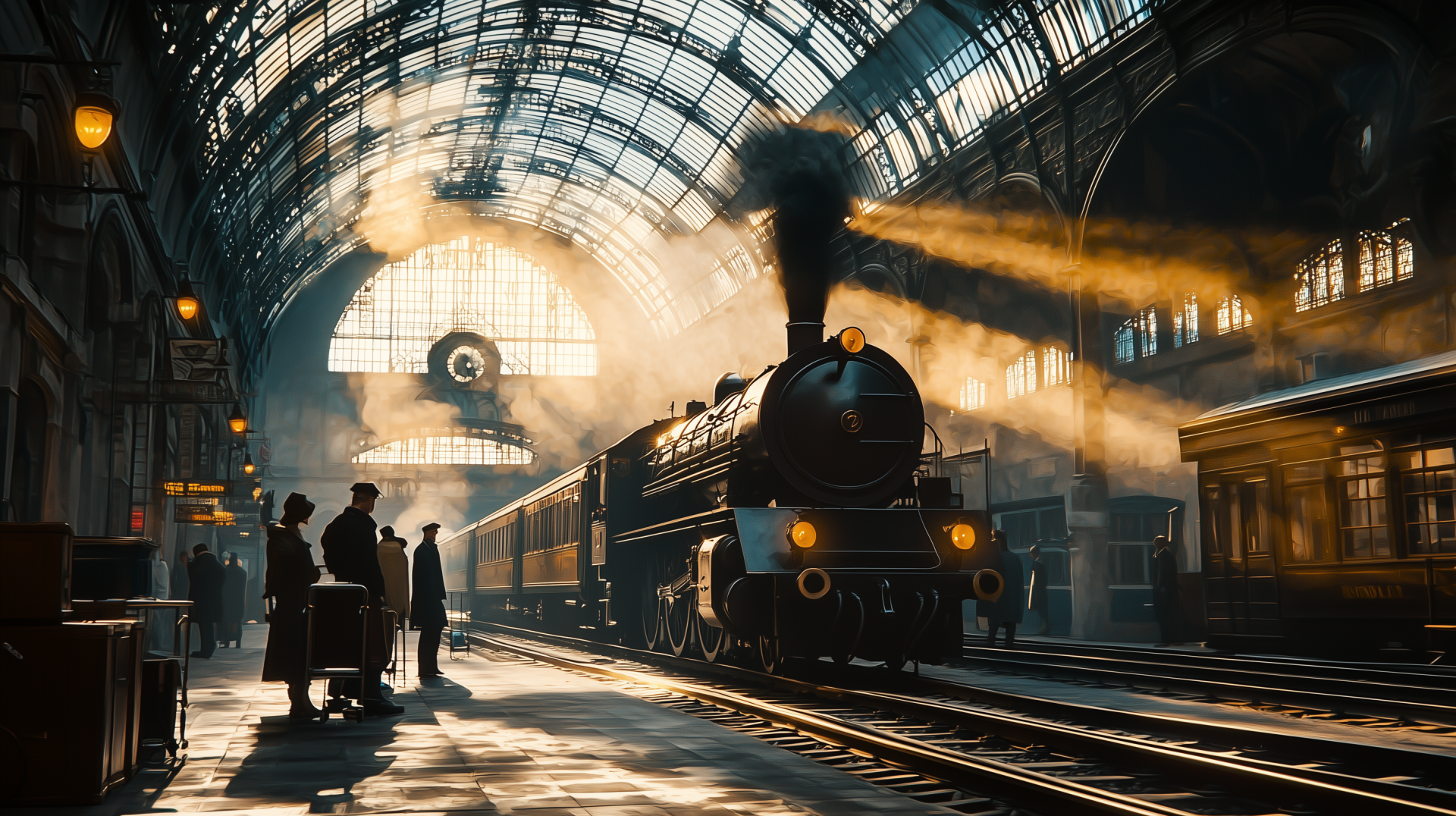 The image captures the grandeur of an old European railway station with an ornate iron and glass roof. Steam locomotives arrive while people dressed in 1930s vintage clothing create a nostalgic atmosphere in the soft ambient light.