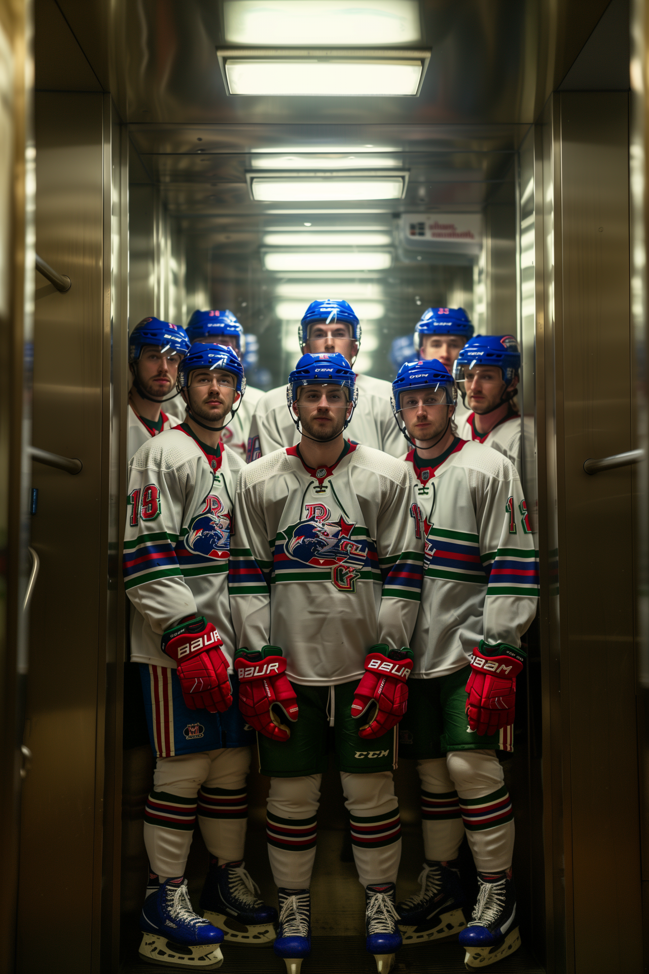 A full body view of multiple Czech hockey players stands inside an elevator, showcasing their white jerseys. The isolated setting against a green screen emphasizes the athleticism and team spirit of the players.
