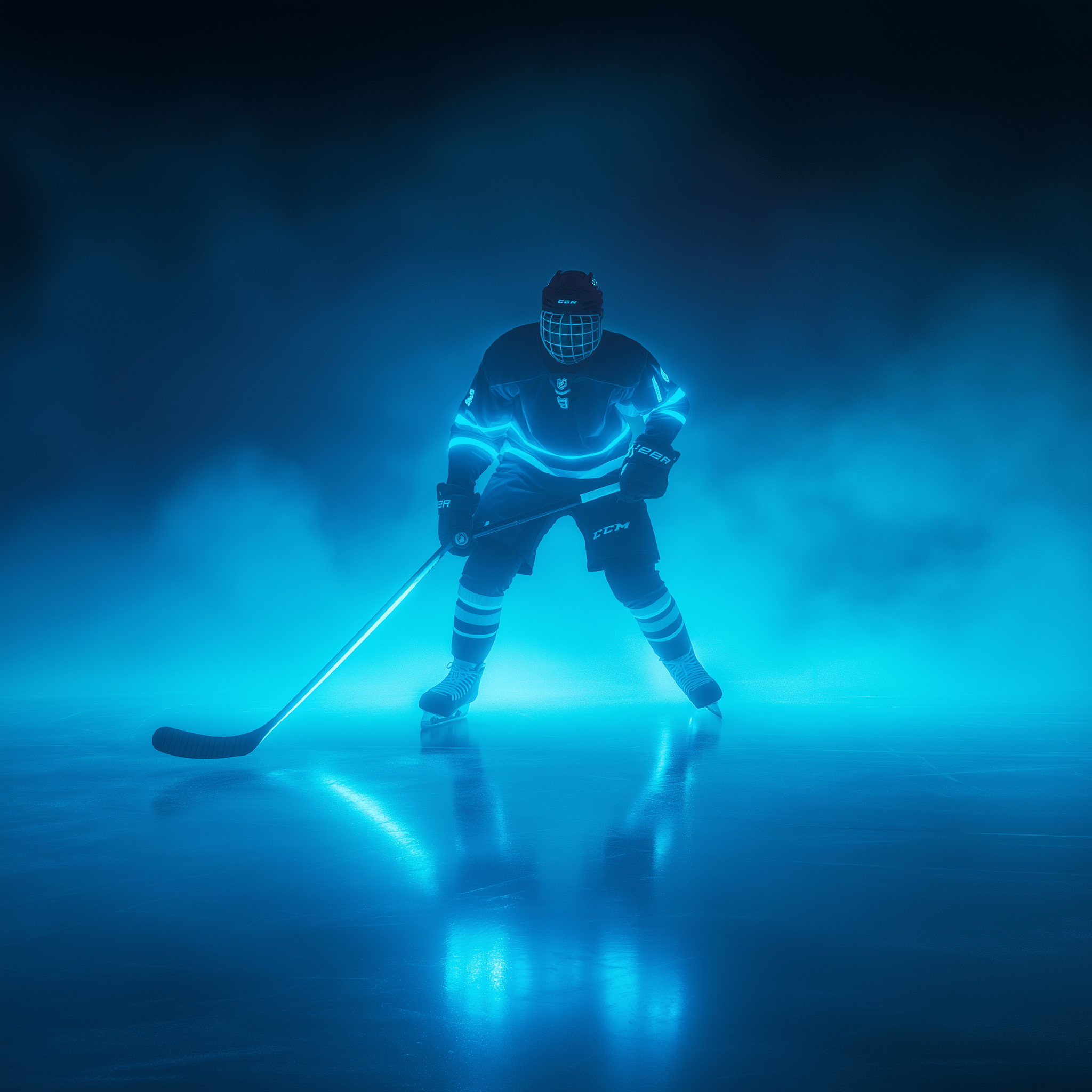The image showcases a hockey player gliding across the ice, surrounded by striking neon blue lights that create a dramatic atmosphere. Fog adds a layer of mystique, enhancing the hyper-realistic feel and the epic nature of the scene.
