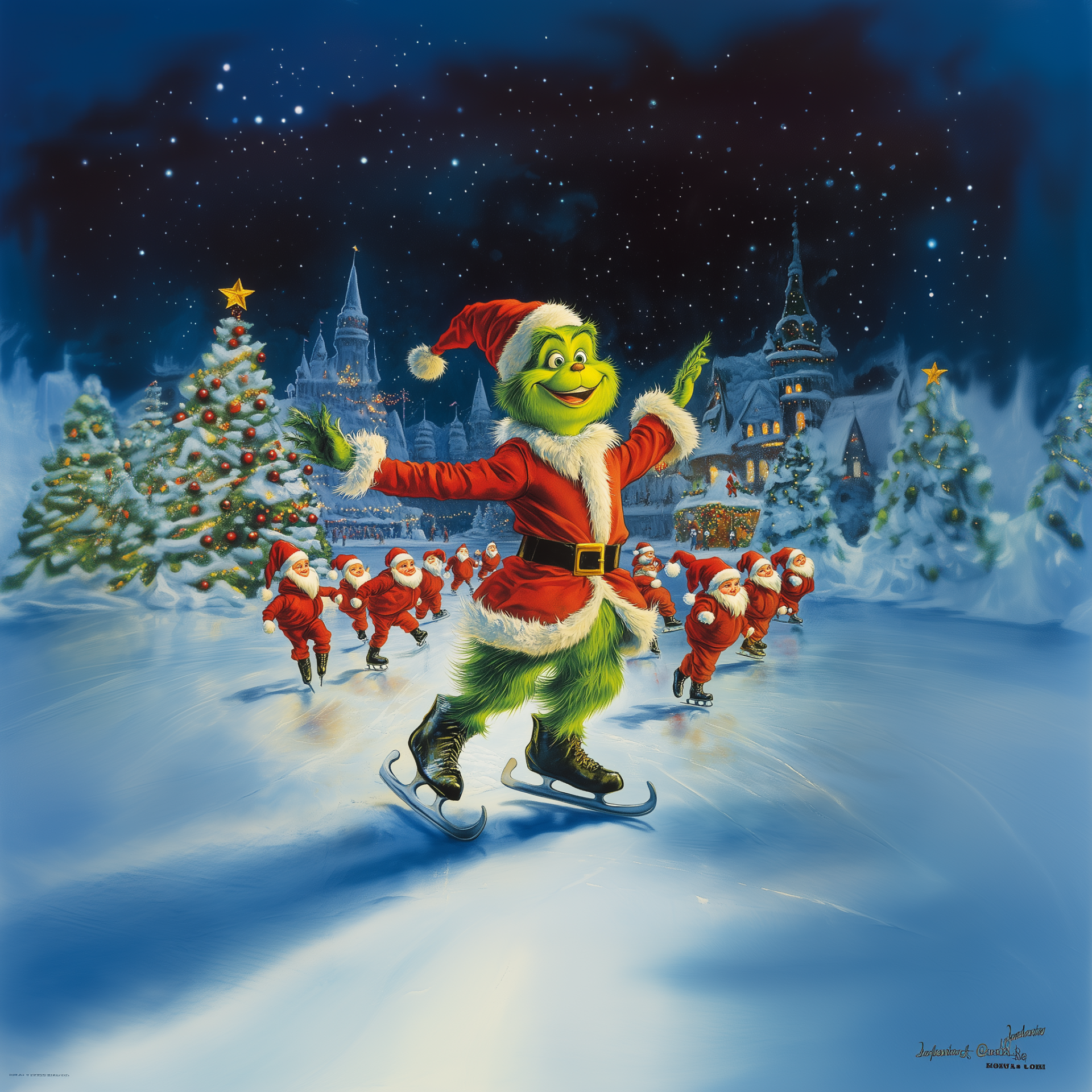 The image showcases a vibrant and whimsical holiday scene featuring the Grinch ice skating with a playful expression. Small Santa figures elegantly skate around him, creating a joyful and festive atmosphere reminiscent of a classic animated film.