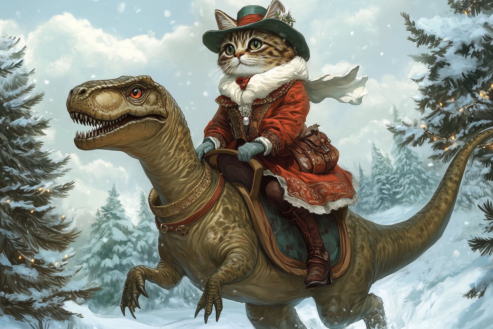 The image showcases a whimsical holiday card featuring a cat dressed in vintage attire. The design is cheerful and festive, filled with warm colors and charming details that evoke a sense of joy and nostalgia.