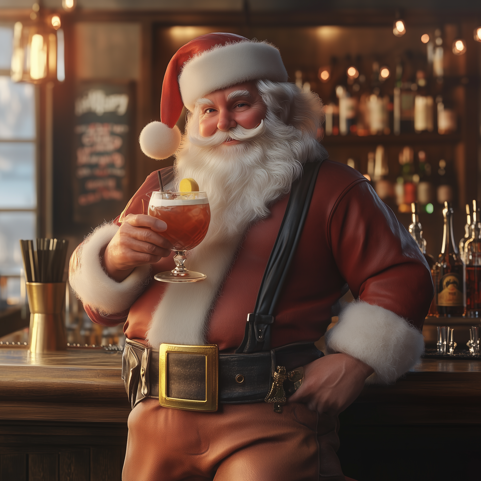 A jolly Santa Claus is enjoying a colorful cocktail while sitting comfortably on a stylish stool at a fancy bar. The vibrant atmosphere and high-quality details create a festive and cheerful ambiance.