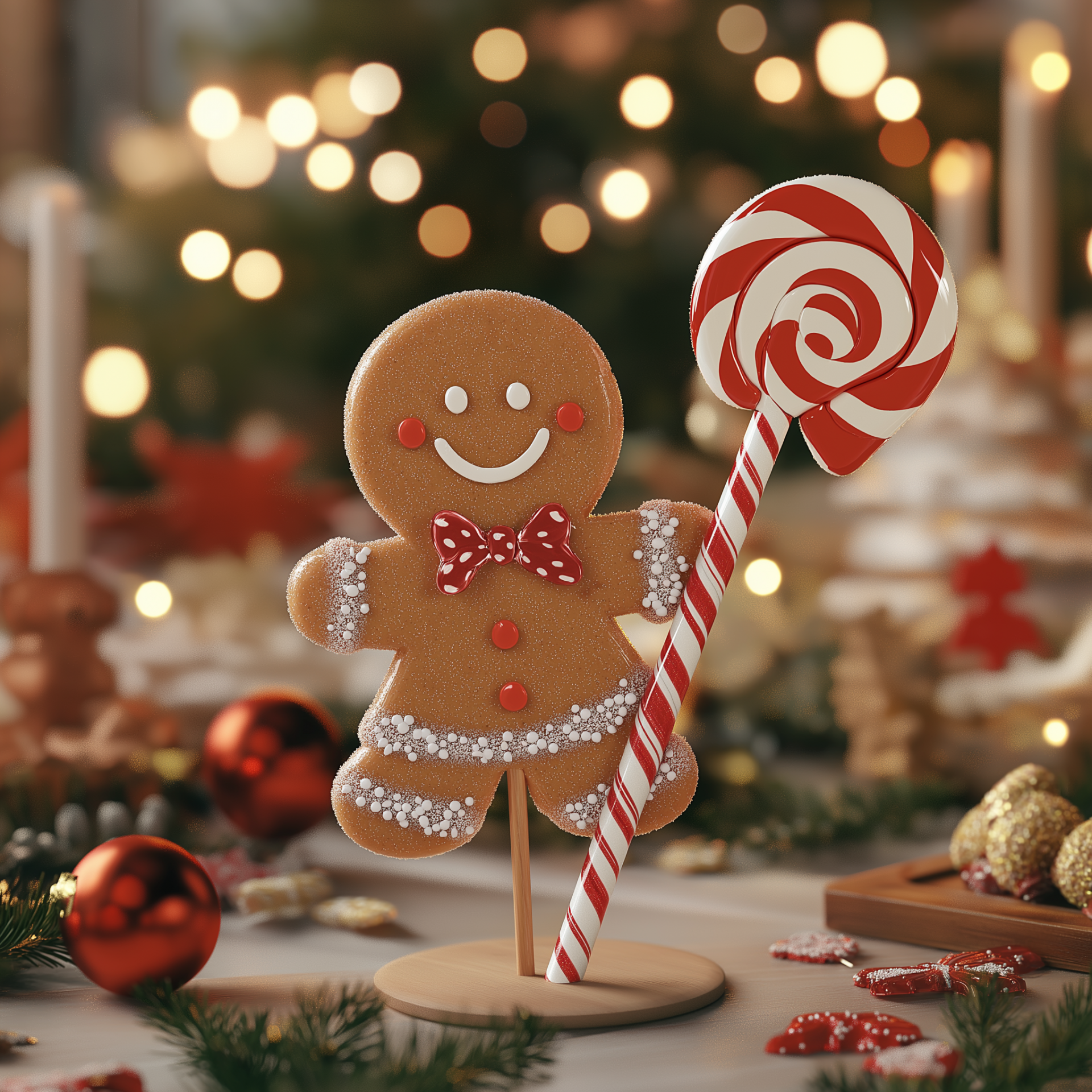 The image features a cheerful gingerbread man with a broad smile, prominently displayed on a festive Christmas table. In his right hand, he holds a large red and white striped candy stick, adding a whimsical touch to the holiday setting.