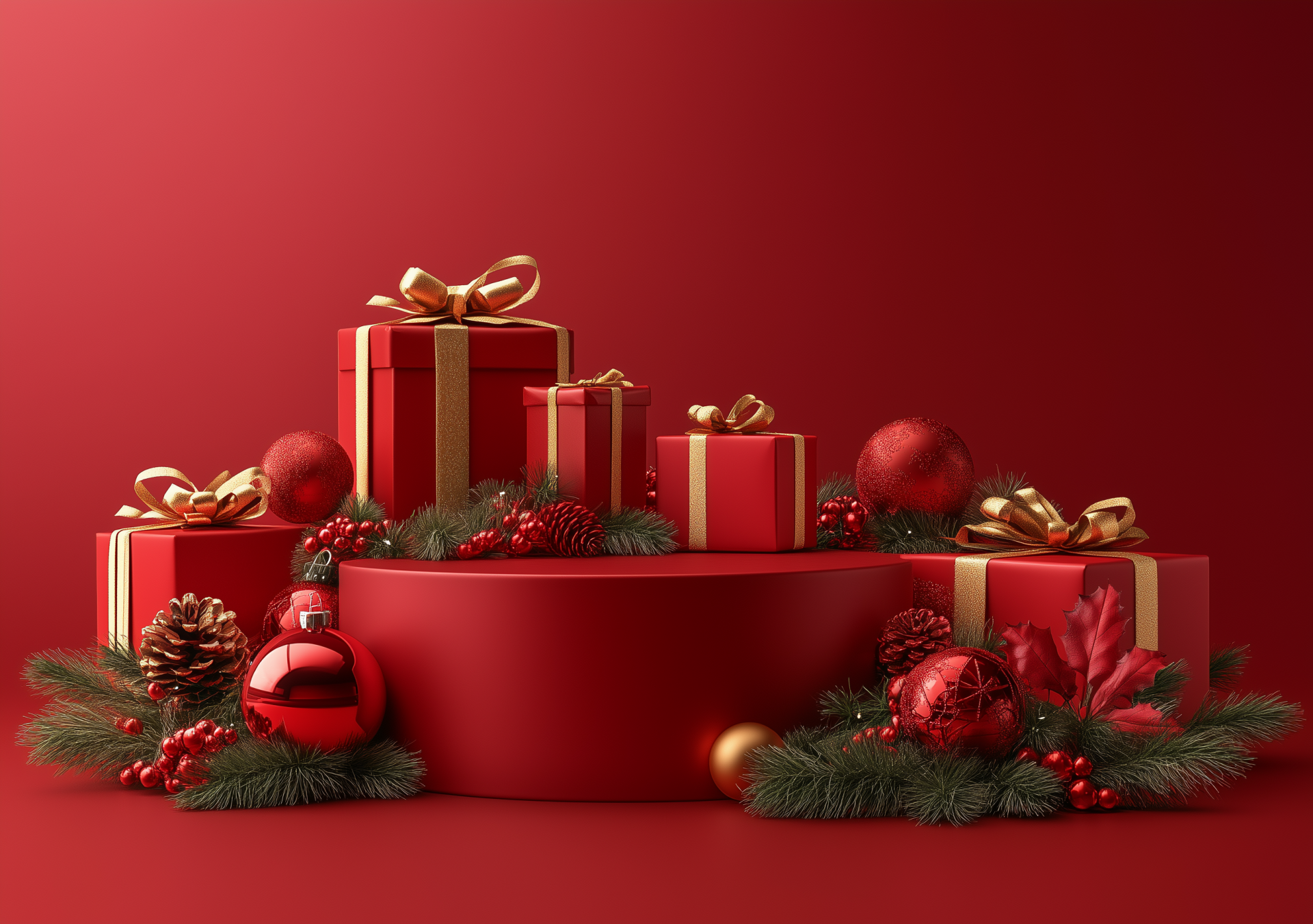 The image features a vibrant red background with a decorative podium adorned with festive Christmas elements. Gold accents and gift boxes enhance the holiday spirit, creating an inviting atmosphere for product promotion.