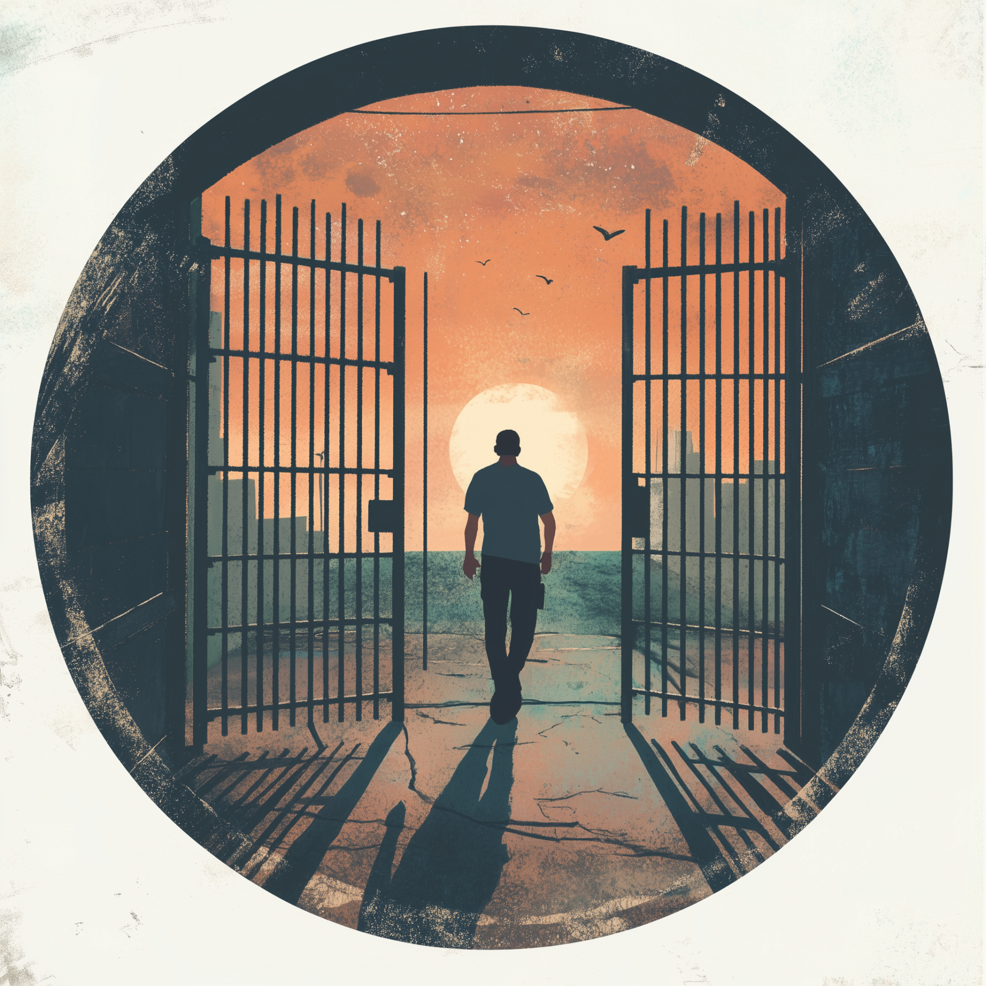 This illustration depicts a hopeful person stepping through the outside gate of a UK prison, symbolizing a transition back to civilian life. The image conveys a sense of optimism and new beginnings with vibrant colors and uplifting elements.