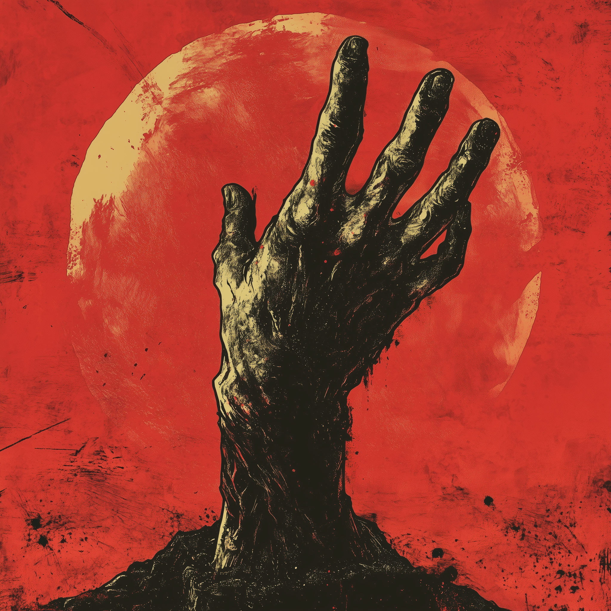 The image features a sinister hand clawing out from a grave, embodying an eerie and chilling atmosphere. Styled like a classic Hammer horror movie poster, the grainy texture enhances the vintage horror feel.
