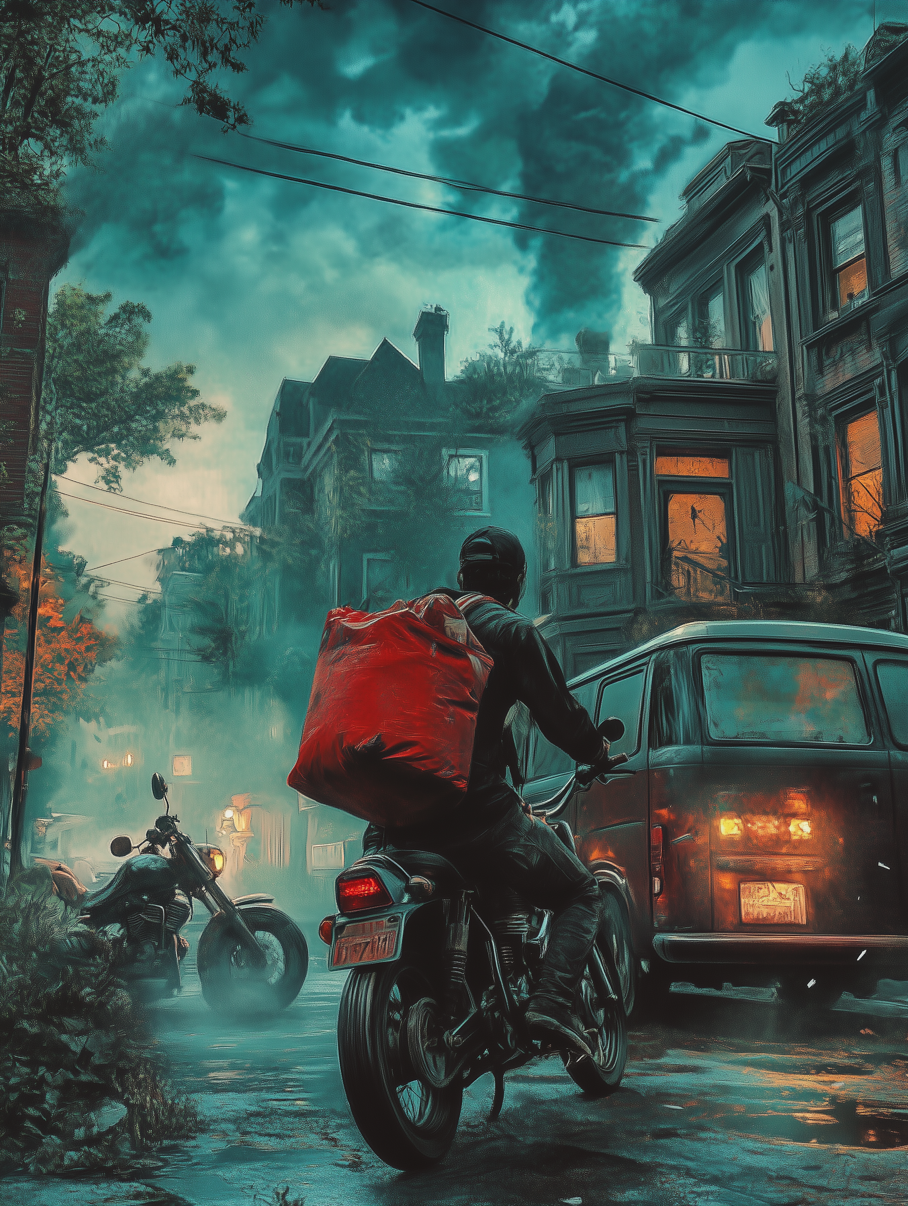 This vintage horror movie poster captures a cinematic scene with a delivery guy standing beside a motorcycle. The hyper-realistic painting style adds an eerie atmosphere, highlighted by a mysterious street and a chilling glimpse into a nearby home.