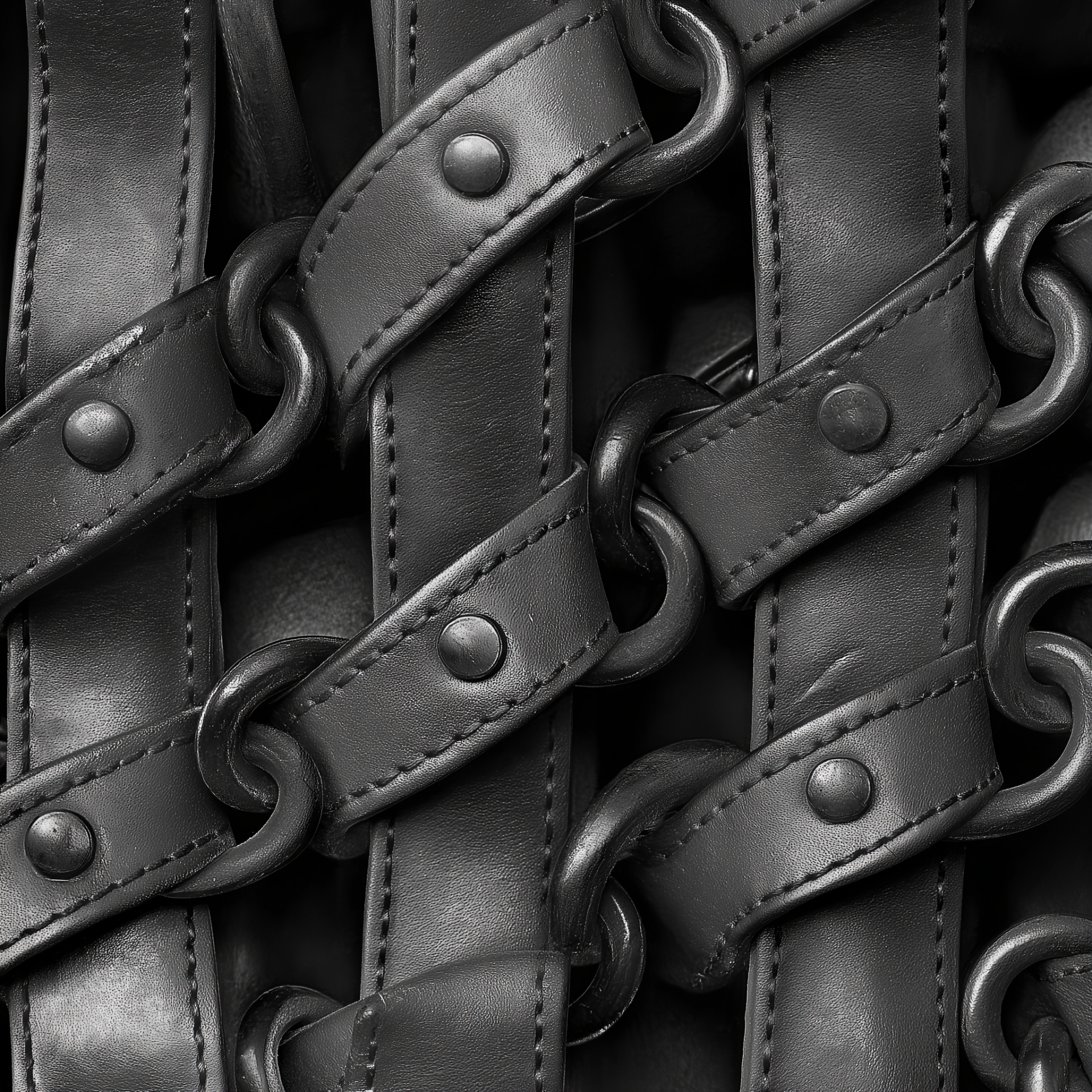 This image features a close-up view of a stack of leather horse bridals, highlighting the intricate details of the leather and brass fixtures. The composition creates a visually striking pattern with intertwining leather parts that evoke a sense of craftsmanship and elegance.