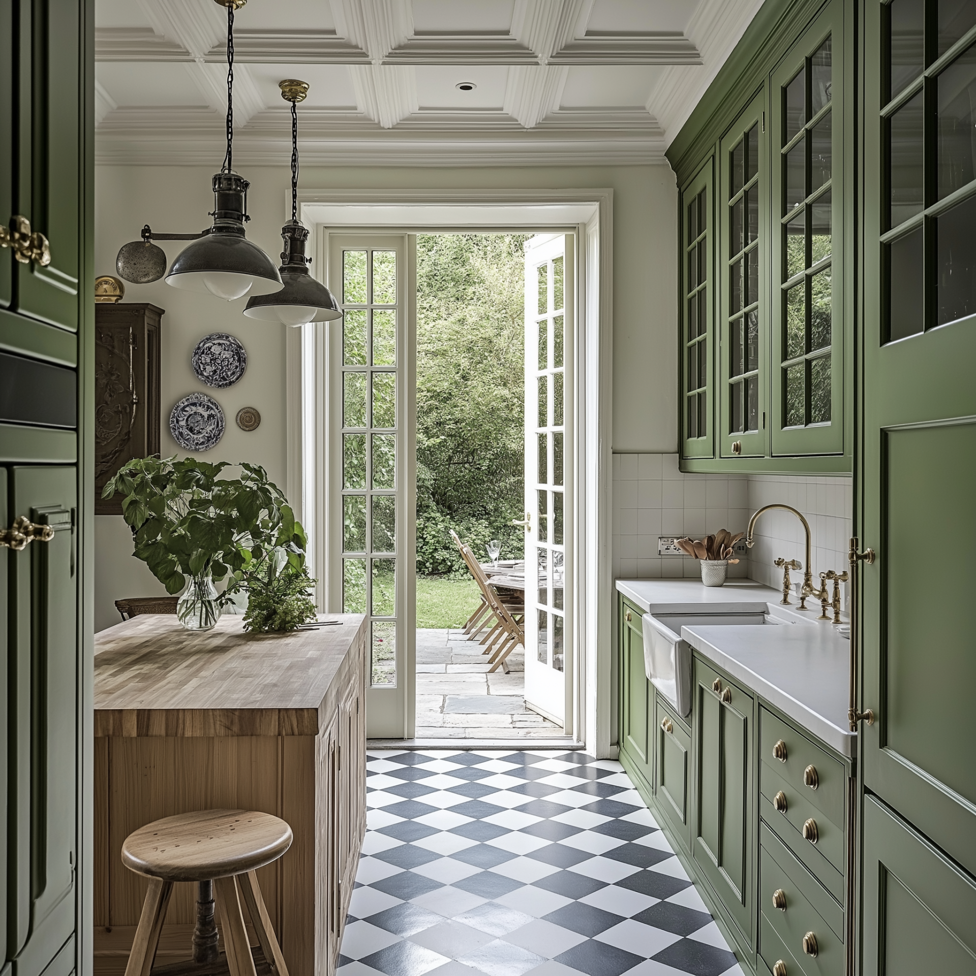This kitchen showcases a harmonious blend of green cabinetry and a crisp white countertop, exuding a fresh and inviting atmosphere. The black and white checkered tiles on the floor add a classic touch, complemented by the airy openness to the dining area.