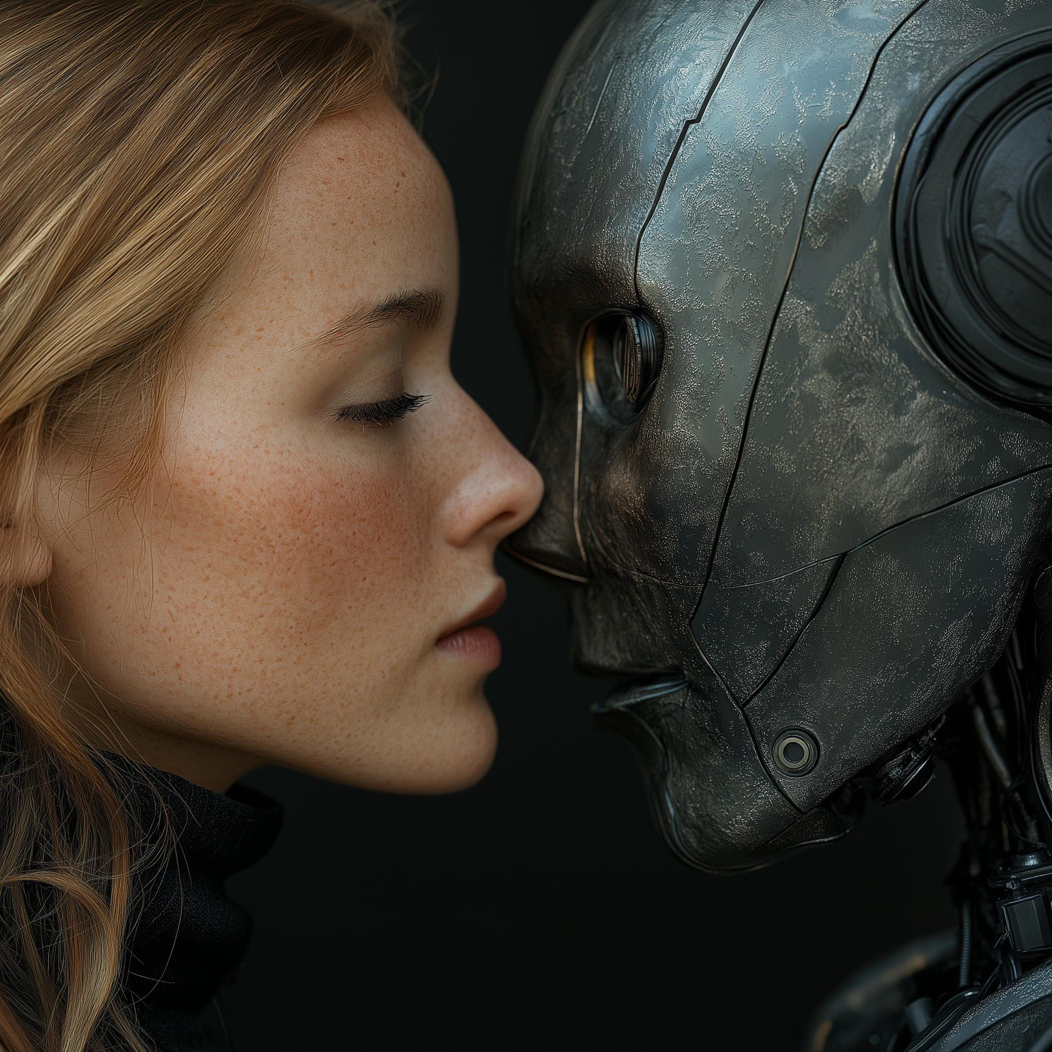 This image features a woman and a robot facing each other, their faces captured in a hyperrealistic style. The scene has a bizarre and humorous atmosphere, evoking a feeling of playful interaction between human and machine.