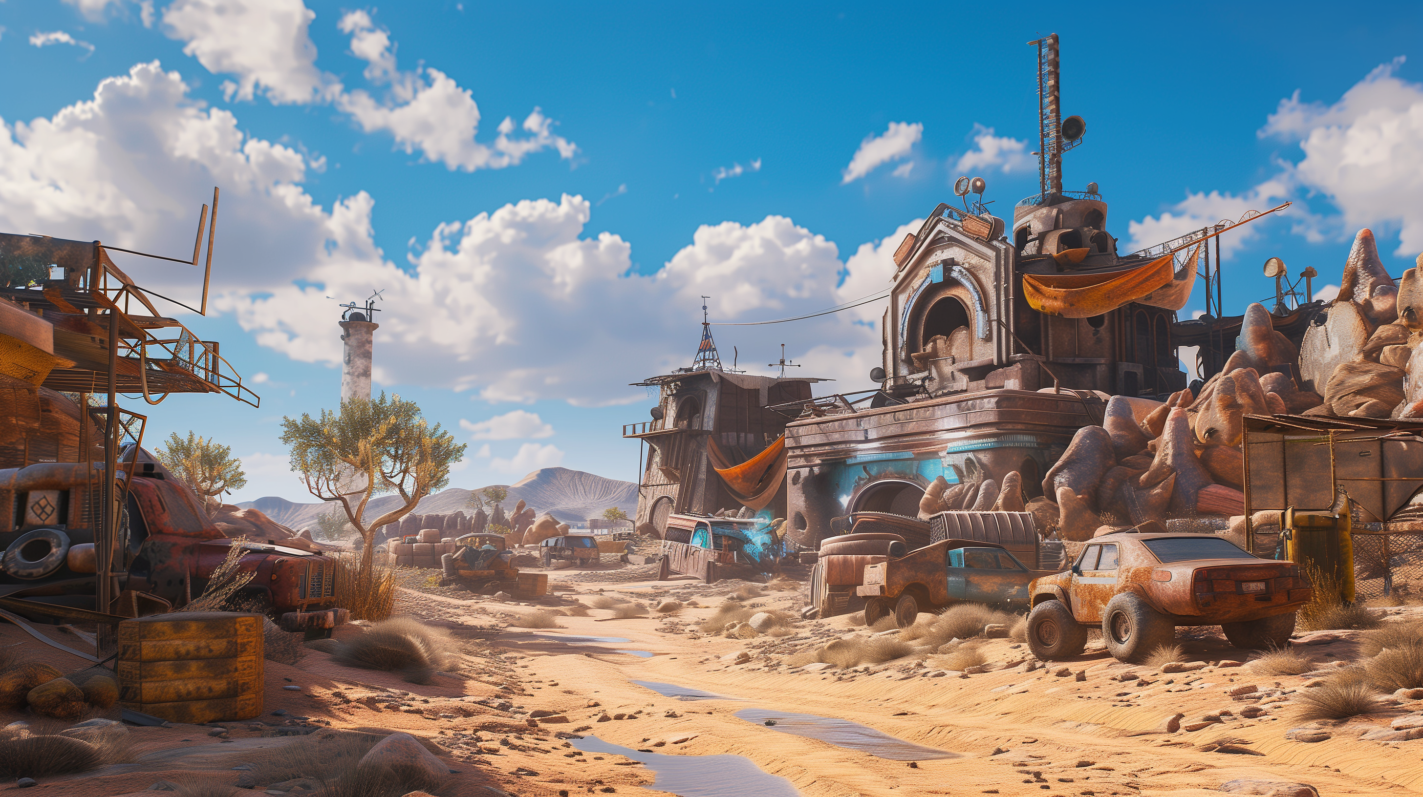 A post-apocalyptic scene on a Fortnite island with a Mad Max-inspired aesthetic. The image showcases hyper-detailed environments rendered in Unreal Engine 5, featuring ray tracing for enhanced realism.