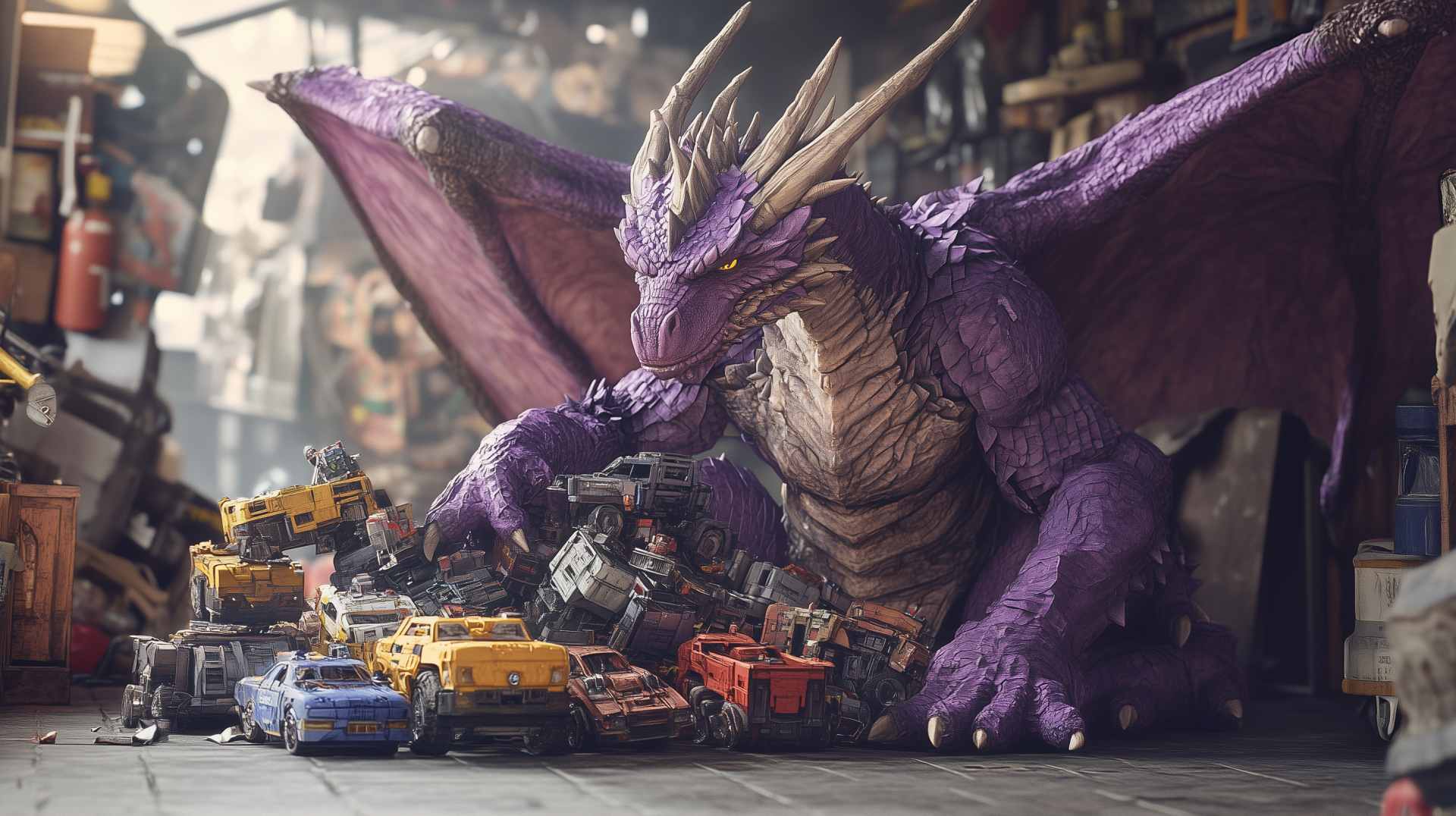 The image features a purple dragon sitting comfortably on the floor, surrounded by a vibrant collection of transformer toys. The dragon's intricate scales and lifelike features evoke a sense of wonder and imagination.