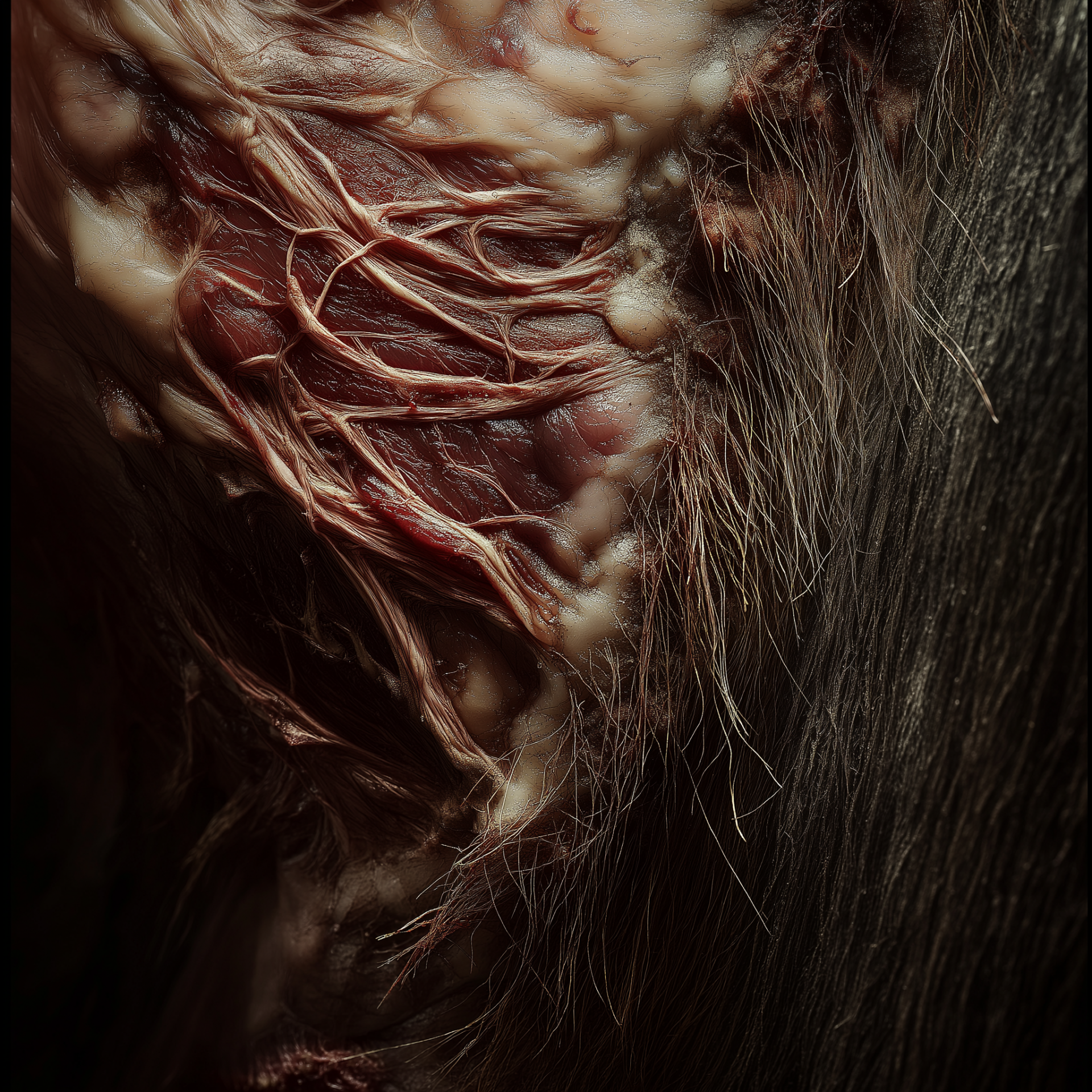 The image portrays a biological graft of stretched skin, with single hairs emerging from its surface. The high contrast setting creates an intense and industrial aesthetic, emphasizing the textures of metal and meat.
