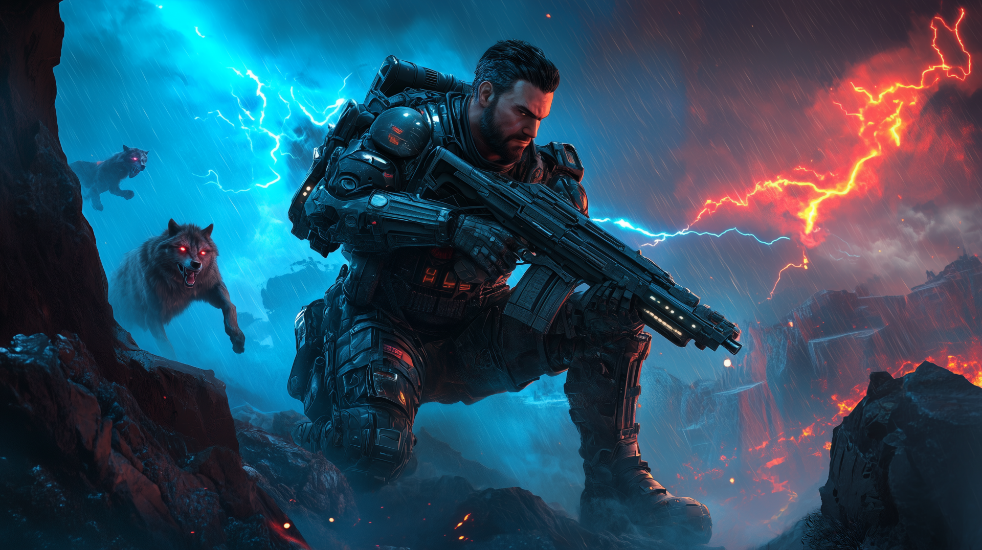 This image features an intense action scene with a gunner in the foreground, crouching and ready for combat. The blue lighting creates a dramatic atmosphere, enhancing the sense of urgency and excitement in the moment.