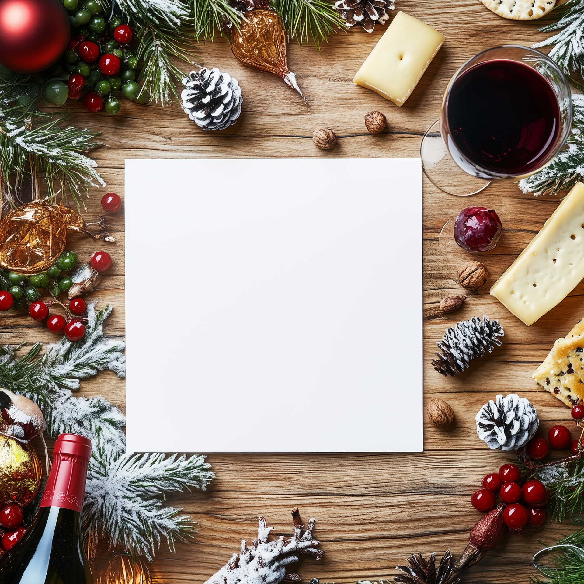 This image features a blank white invitation mockup set in a landscape orientation. The design is simple yet elegant, perfect for a festive wine and cheese themed party.
