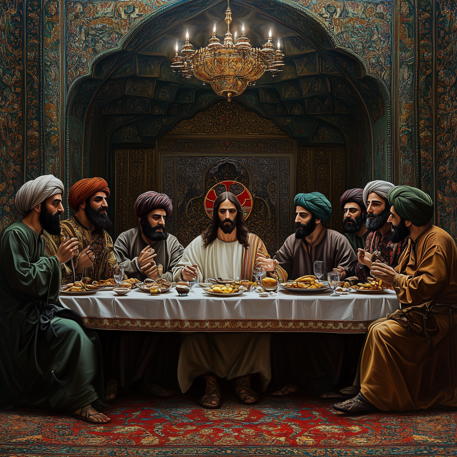 This highly realistic image depicts the Last Supper, featuring famous Iranian figures instead of traditional biblical ones. It is adorned with intricate traditional Iranian motifs, creating a vibrant and culturally rich atmosphere.