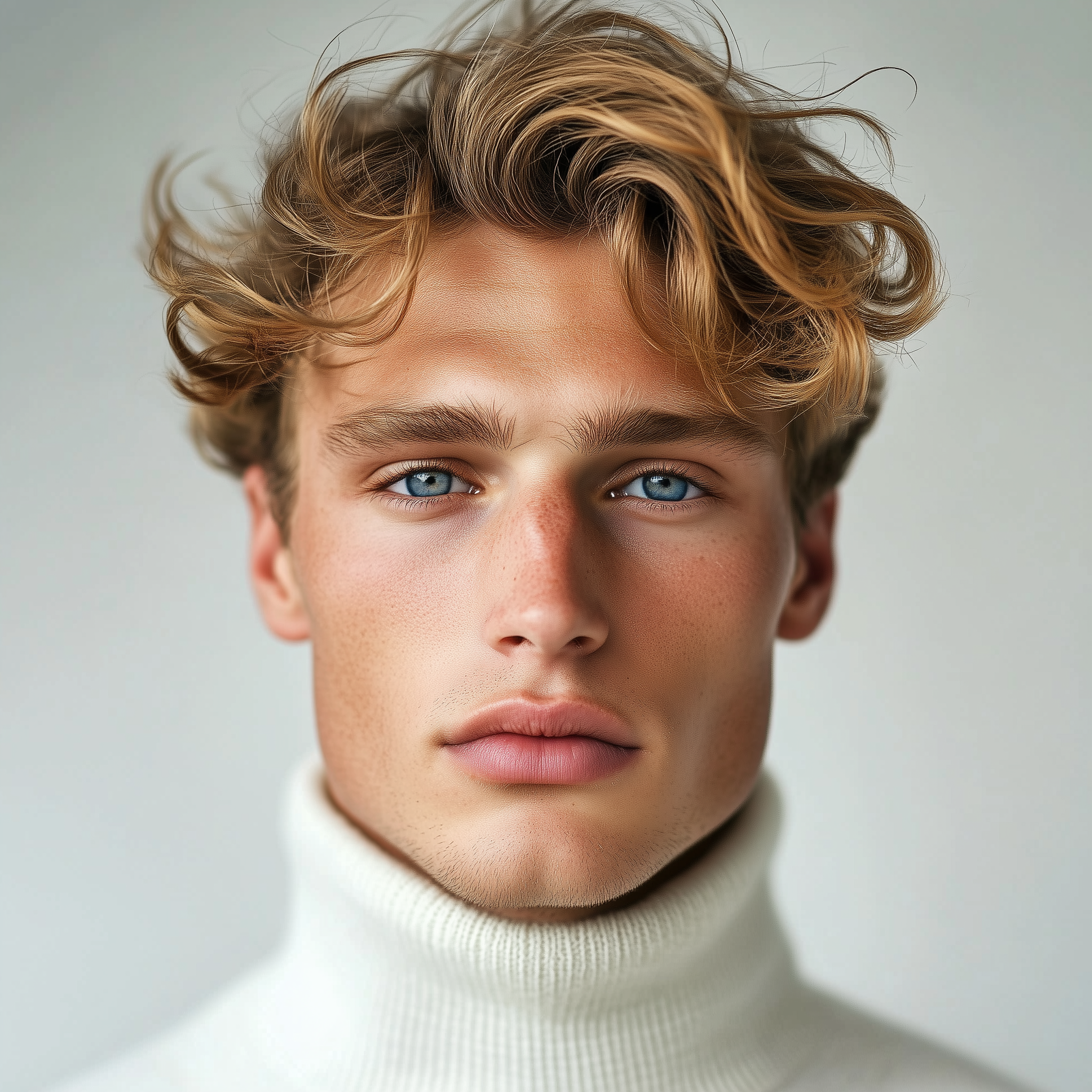 The image features a handsome Italian man with striking golden hair and captivating blue eyes. His strong cheekbones and beautiful lips create an impressive and alluring appearance.