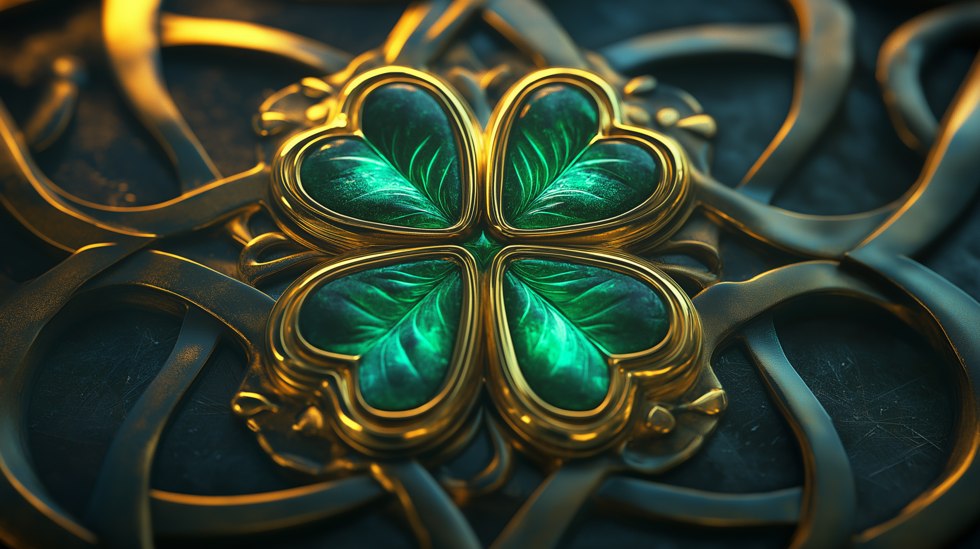 This artwork showcases a beautifully intricate design centered around a magical four-leaf clover. The clover, made of gold and jade, radiates a soft glow amidst an elaborate Irish-themed background.