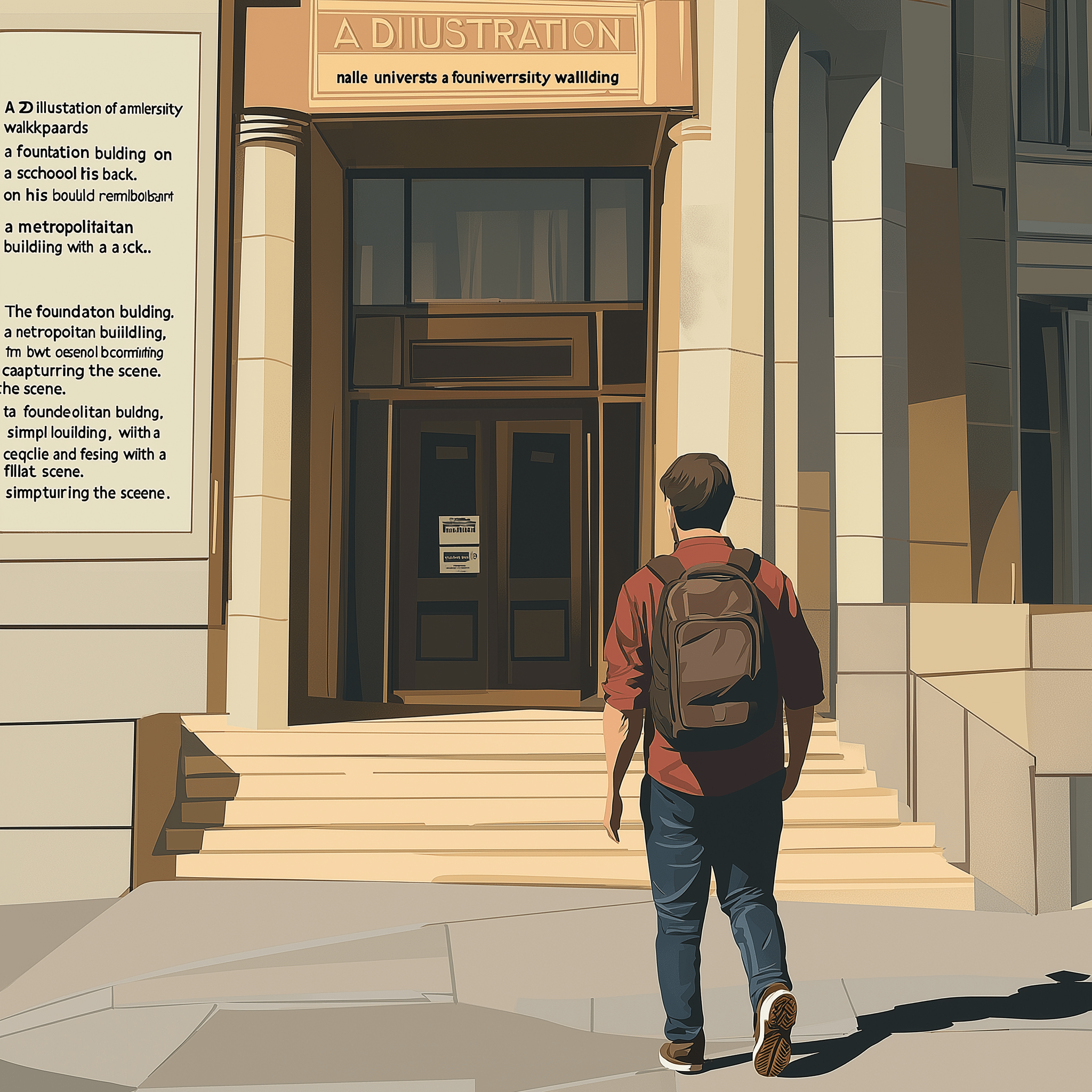 A minimalist 2D illustration featuring a male university student walking towards a modern foundation building. The artwork is characterized by a simple and flat design, capturing a metropolitan atmosphere.