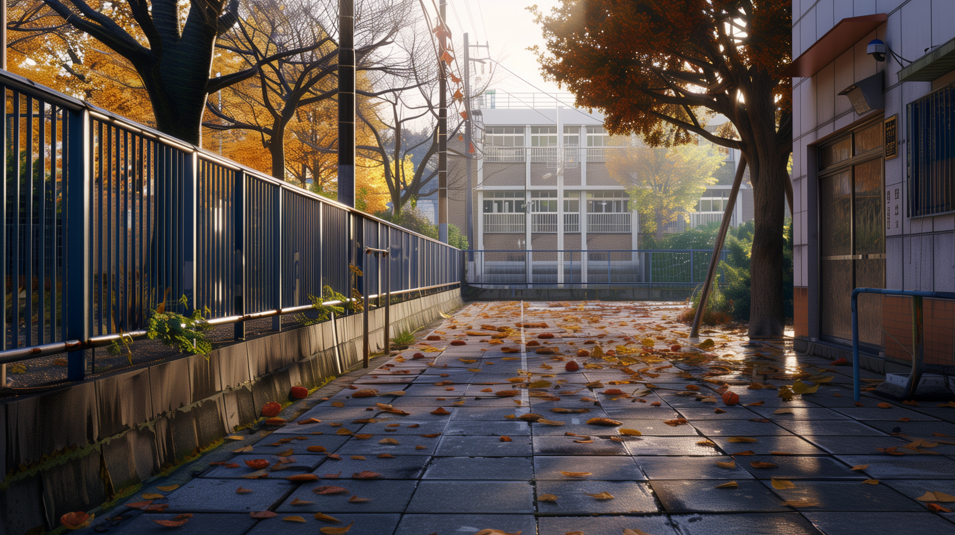 The photo captures the tranquil edge of a Japanese high school basketball court, highlighting the outer walkway and surrounding metal fences. Soft afternoon sunlight filters through fallen leaves, creating a nostalgic and peaceful atmosphere.