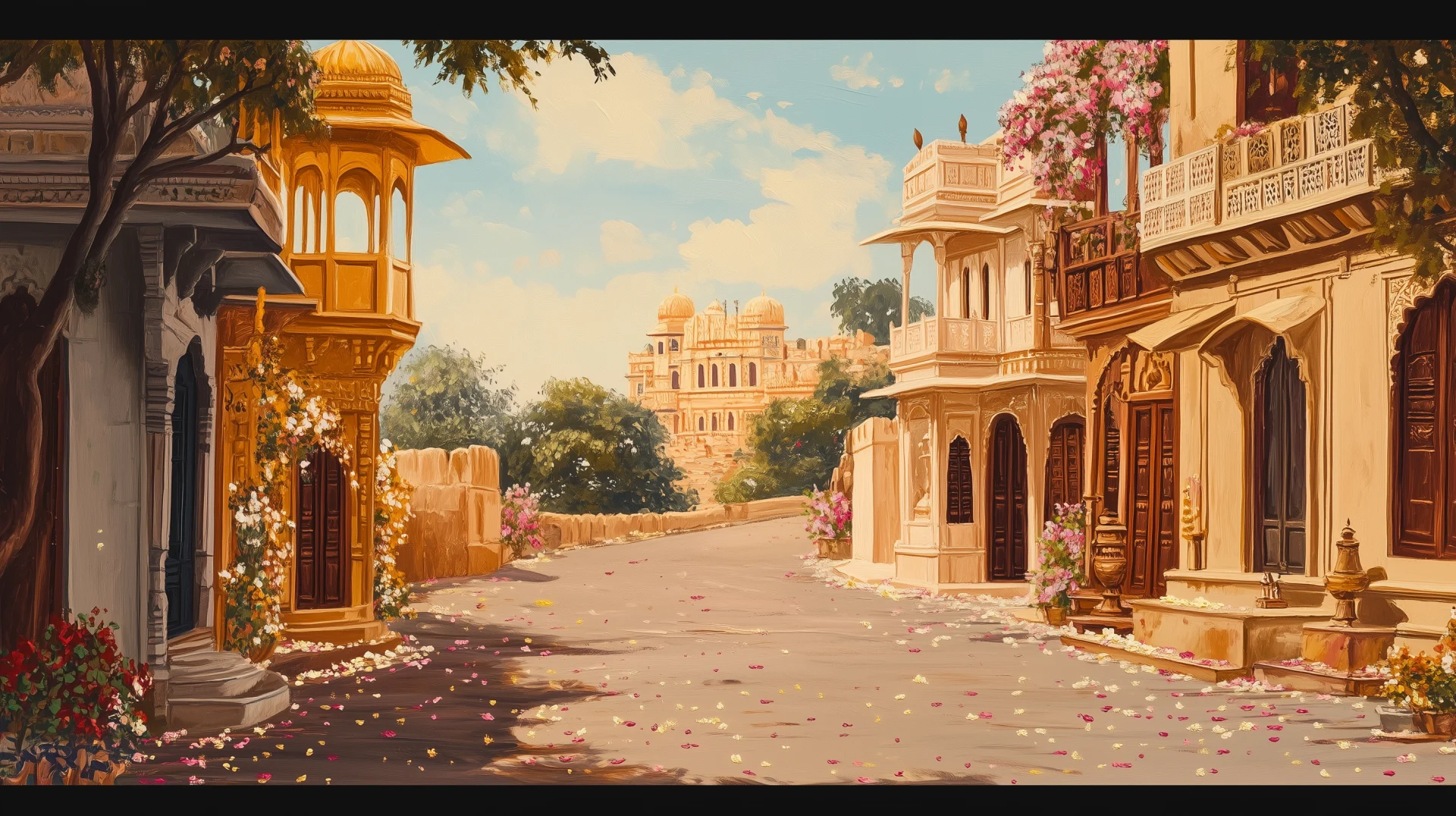 The illustration portrays a hodded figure traversing a vibrant desert landscape. The figure is adorned with a traditional Japanese demon mask, creating a striking contrast against the warm colors of the surroundings.