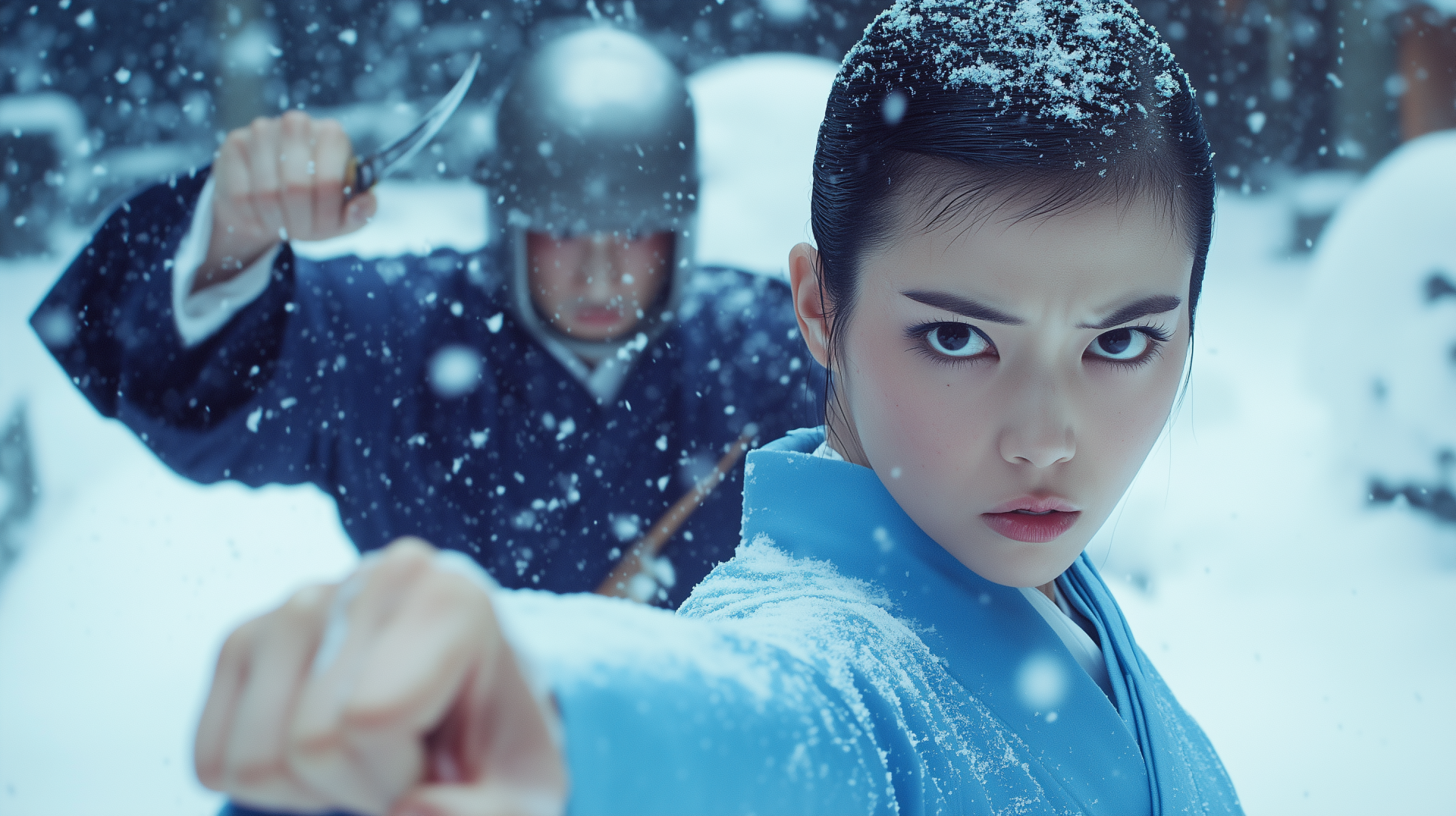The image captures a dramatic scene amidst a snowstorm, featuring a Japanese man in a blue kimono. His intense gaze is met with the striking presence of a futuristic robot in the background, adding an intriguing contrast to the traditional attire.