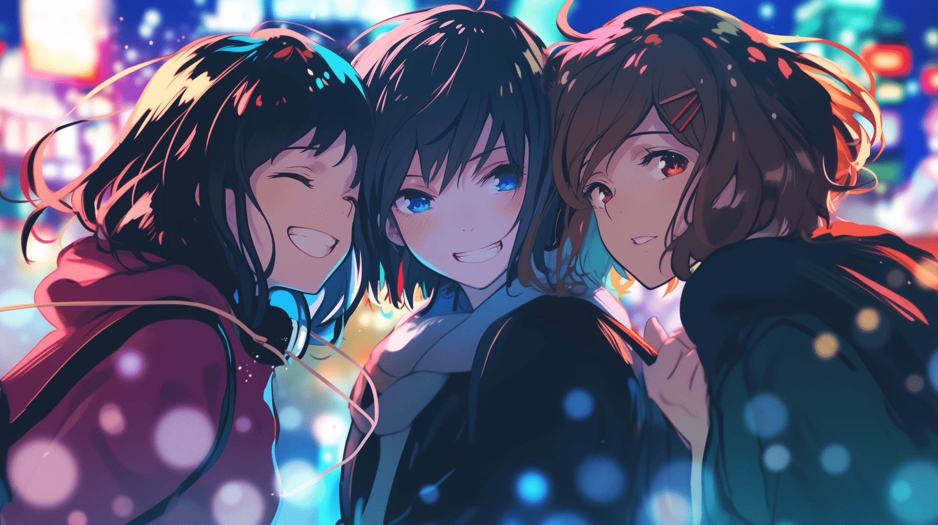 The image captures a long shot of three beautiful Japanese women enjoying a joyful moment together under the neon lights of Tokyo at night. The background is artistically blurred, enhancing the warmth and happiness radiating from the women as they smile.