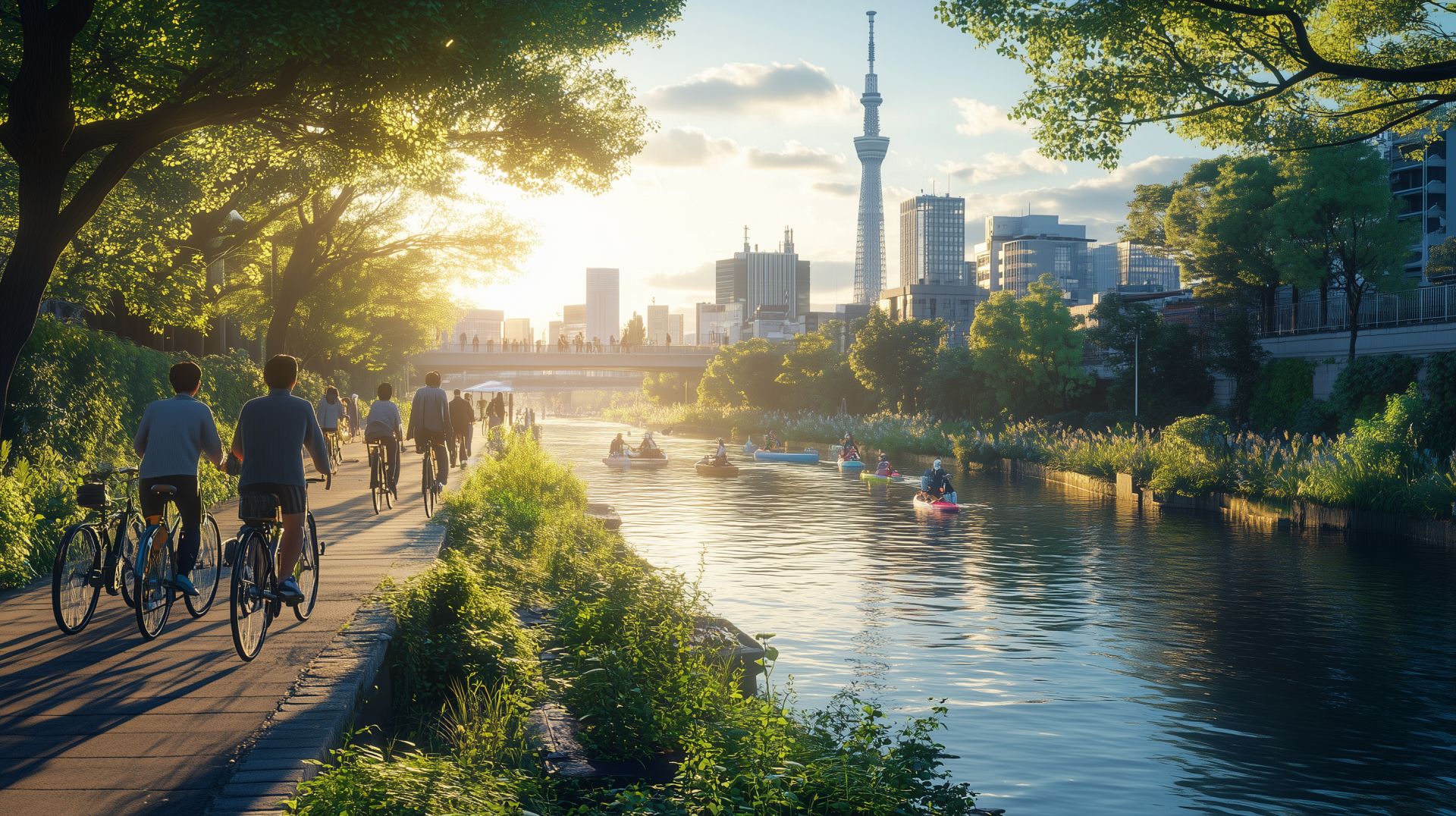 This image captures the vibrant atmosphere of daily life in Tokyo, featuring people engaged in various activities. The photorealistic style highlights the bustling city, with warm morning light and colorful scenes that evoke a sense of energy and community.