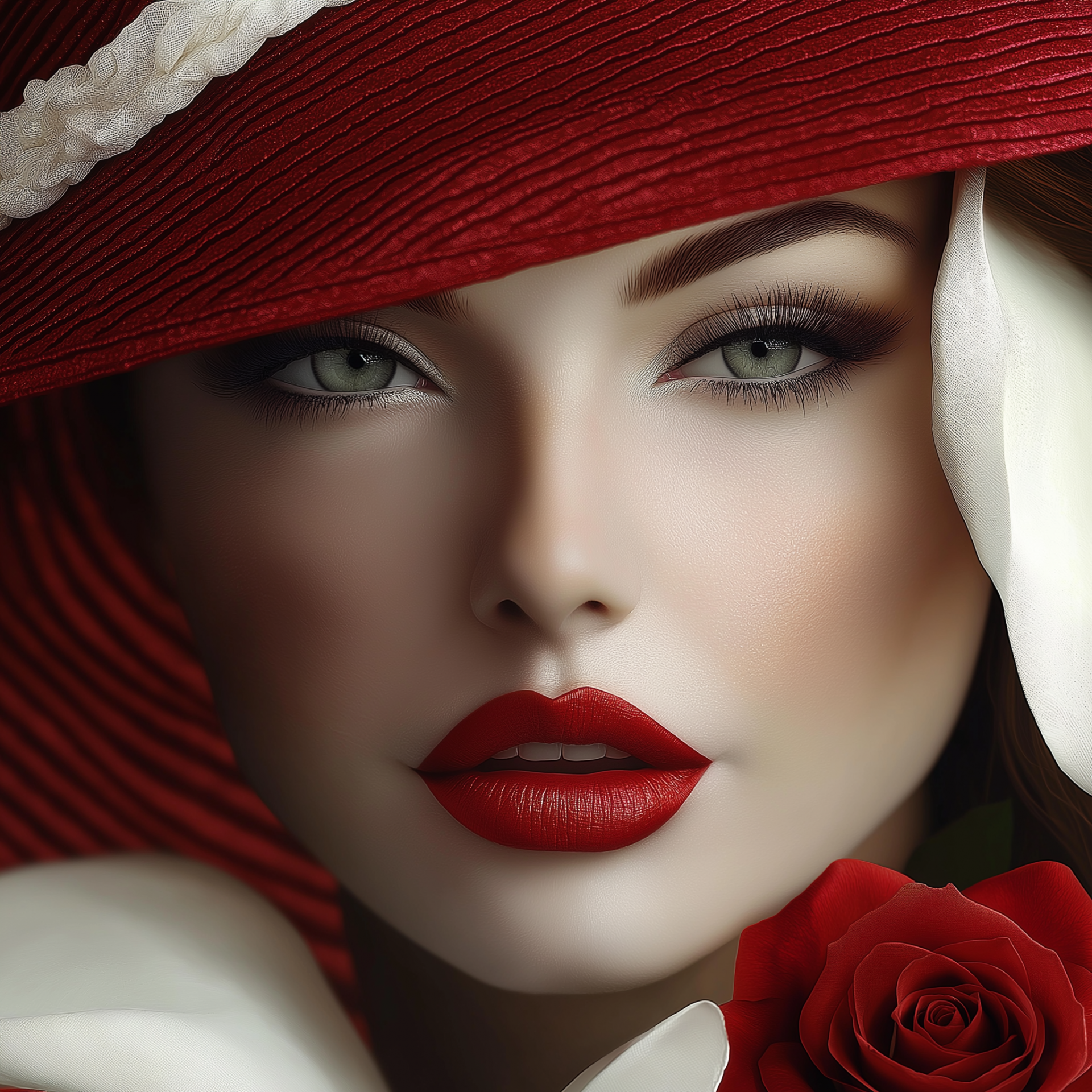 This image features a stunning lady dressed in a vibrant red and white outfit, exuding elegance and charm. Her natural eye makeup and long lashes enhance her beauty, complemented by a matching red and white hat as well as a delicate rose.