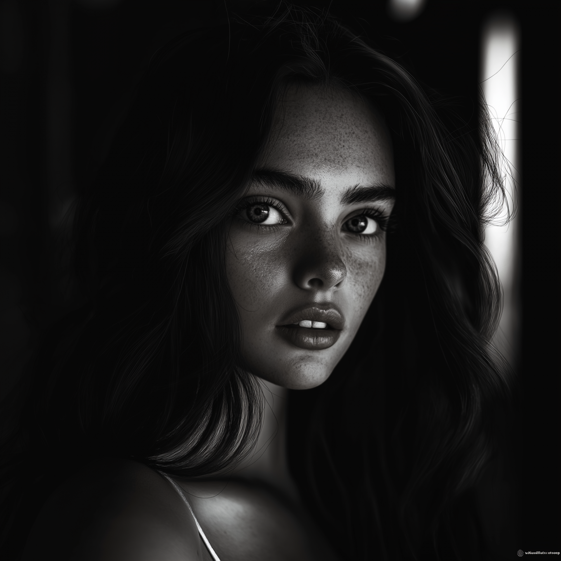 This image features a realistic portrayal of a girl’s face in a three-quarter view. The black and white style adds a timeless and classic feel to the portrait.