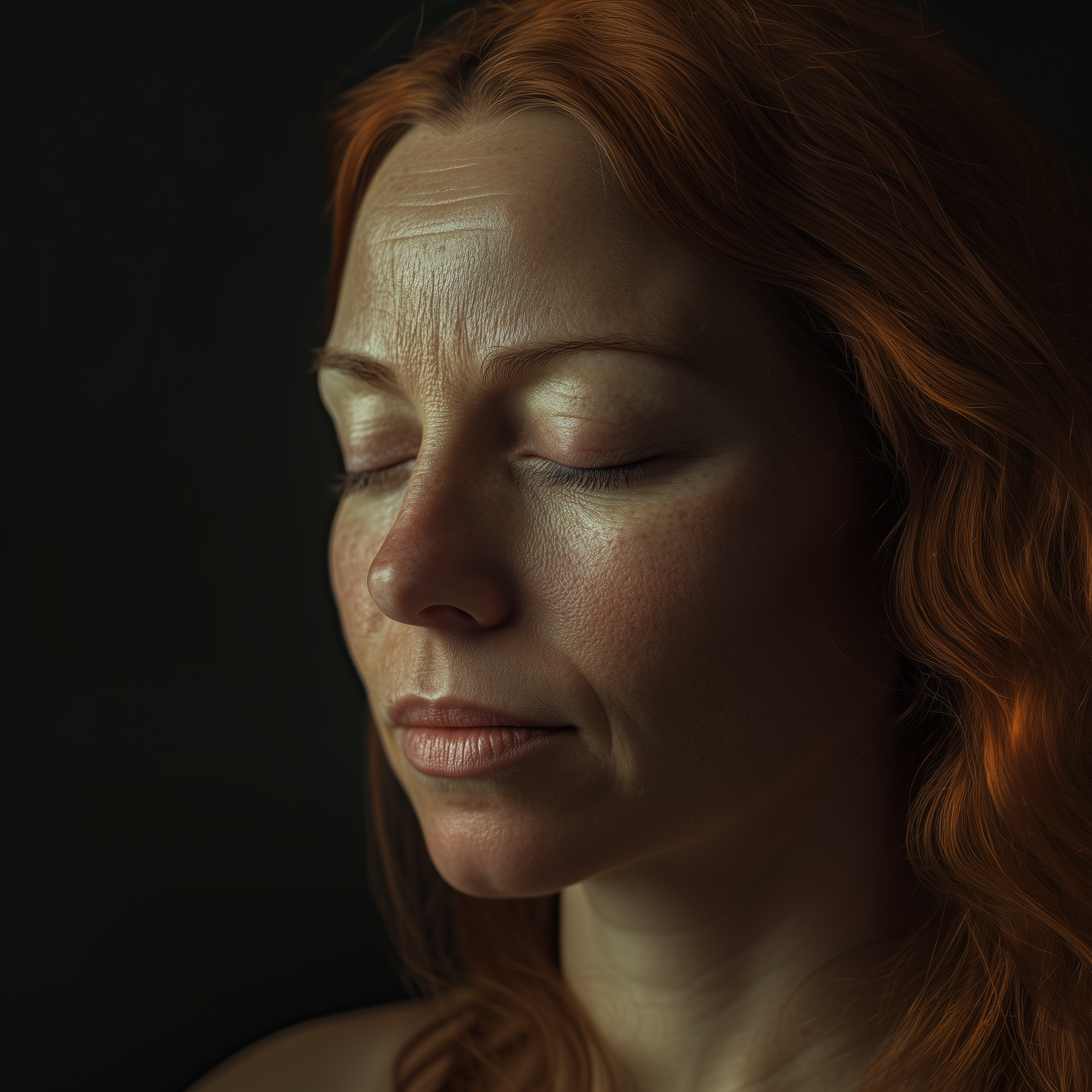 The image features a serene portrait of a middle-aged woman with her face slightly turned to the left and her eyes closed. The dark studio background enhances the peaceful expression and contours of her face.