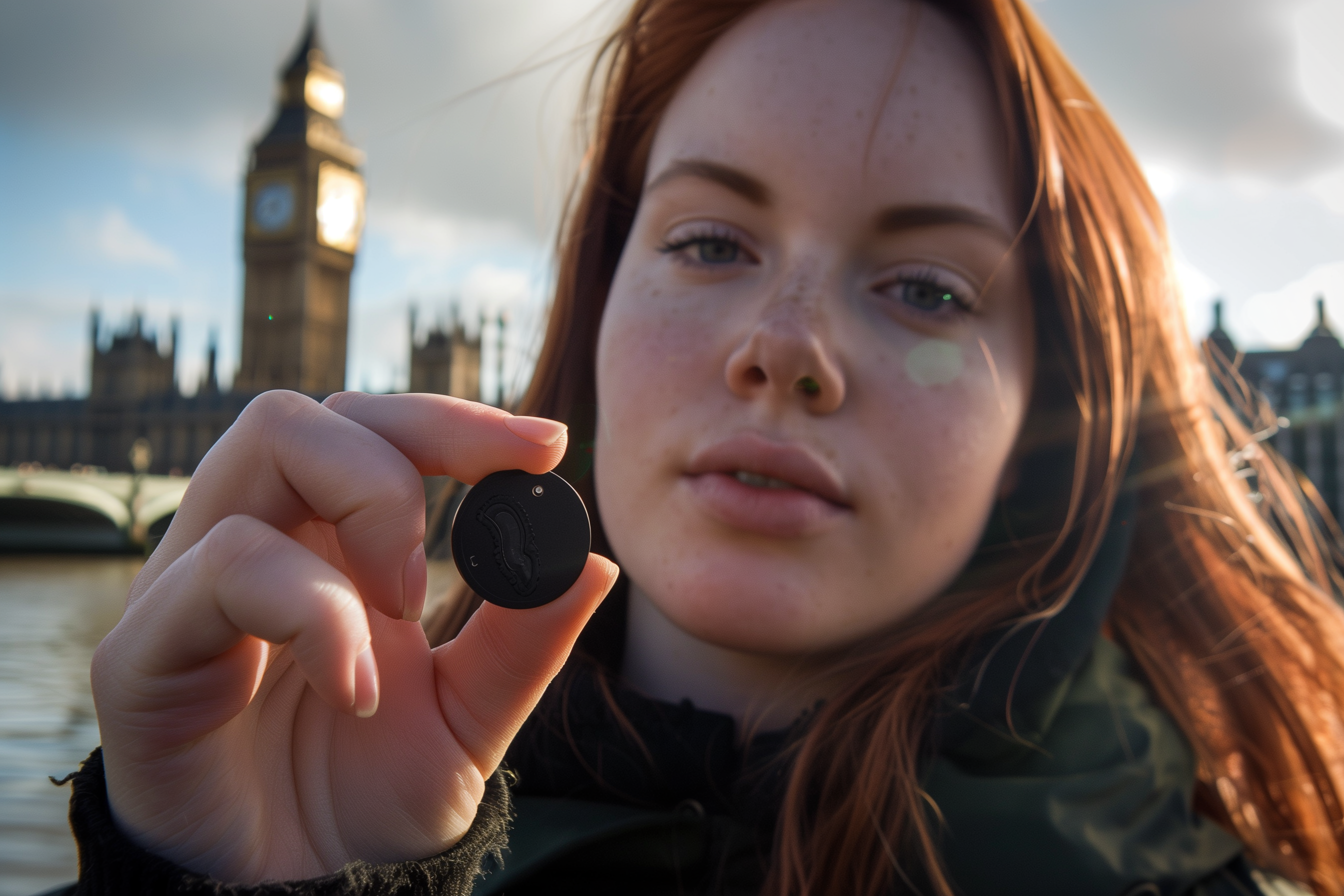 The image features a woman with copper hair taking a selfie while holding a small black pet tag. She has a smug expression and a UK landmark is visible in the background, all highlighted by bright lighting.