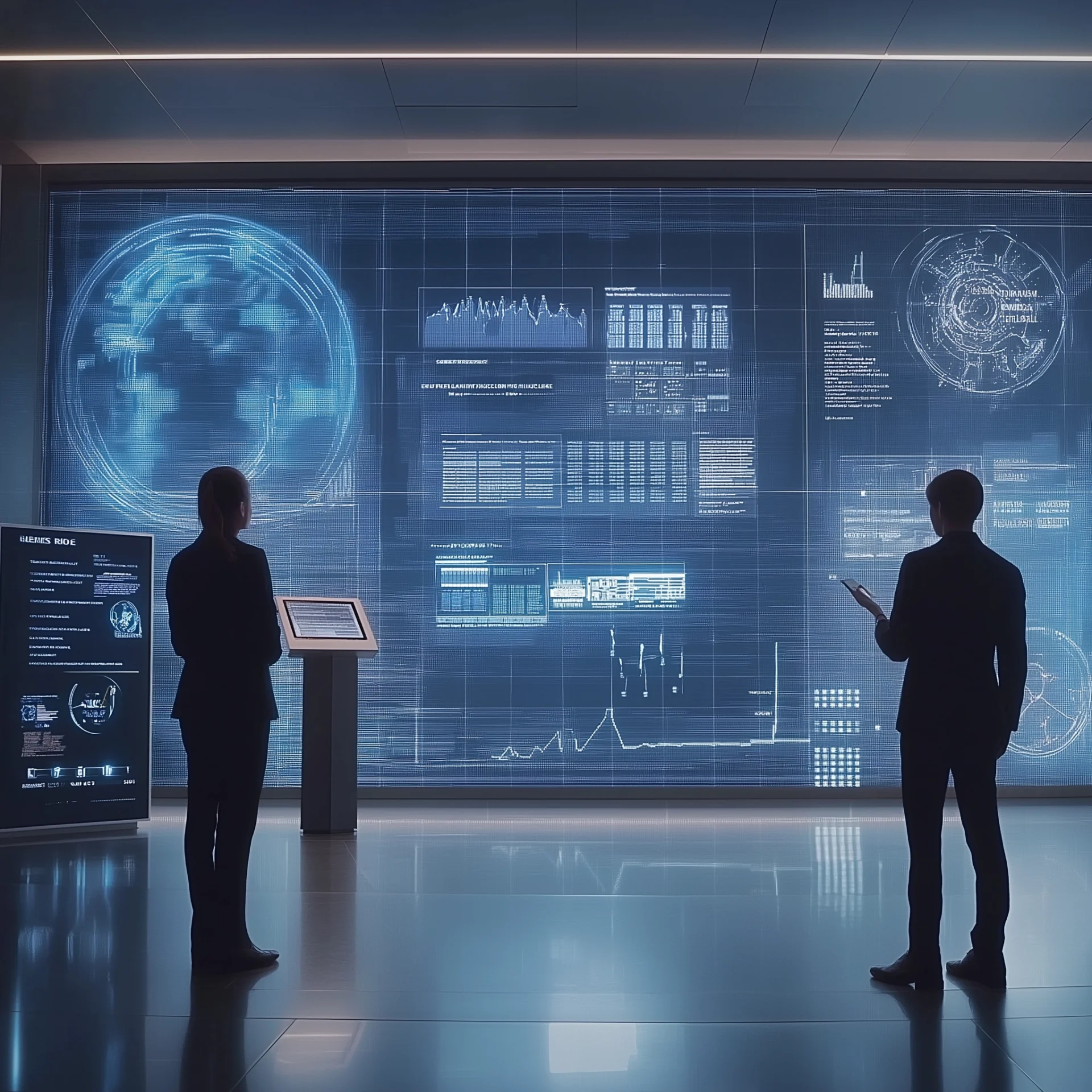 The image portrays a businesswoman with a satisfied expression, her hand extended into a swirling cloud of artificial intelligence and data elements. The detailed representation evokes a sense of innovation and achievement in a modern business context.