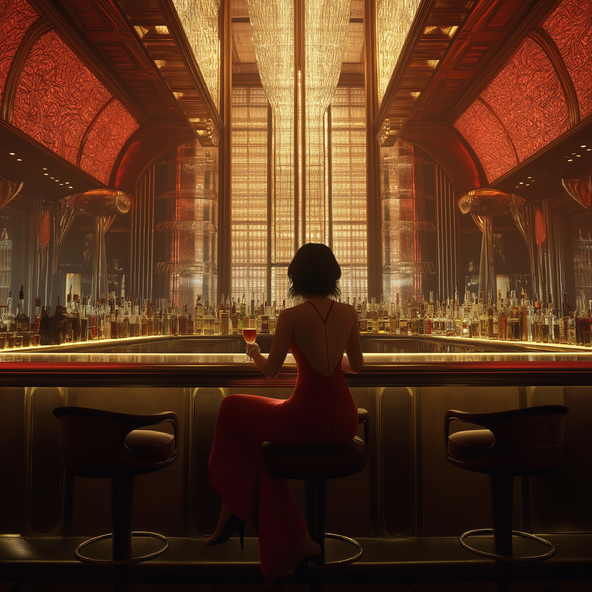 This cinematic wide shot captures the elegance of a woman in a vibrant red dress and high heels sitting gracefully at a bar. The Art Deco setting adds a touch of vintage glamour to the atmosphere.