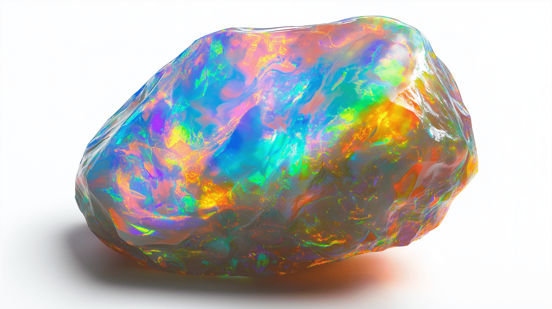 A massive opal sits prominently against a clean, pure white background, glowing with a mesmerizing play of light and color. Its natural translucence is highlighted by scintillating flashes of vivid hues, creating an enchanting visual experience.
