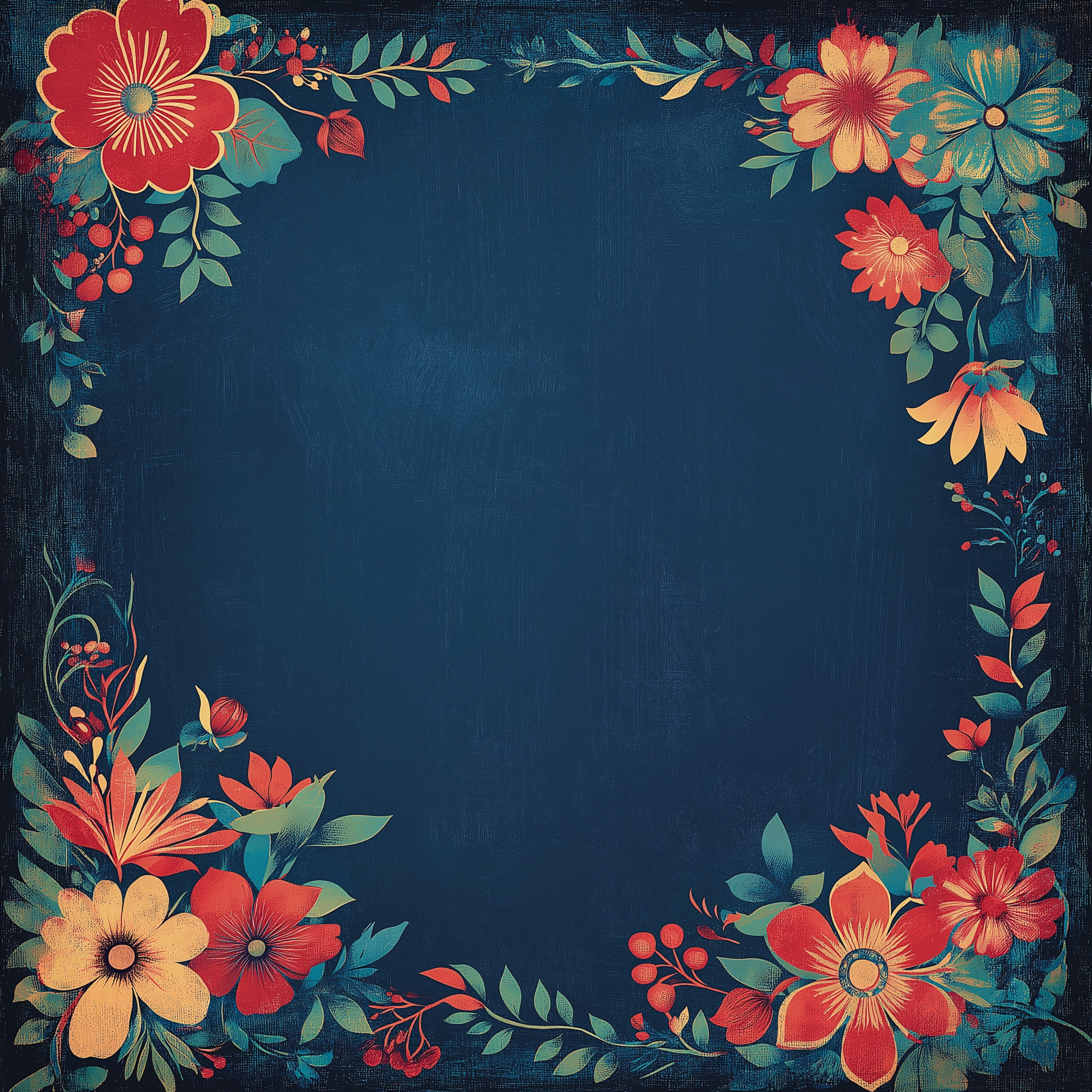 The image features a kitschy vintage folk art style with a floral border against a navy backdrop. It showcases vibrant red and blue jewel tones, creating a striking visual contrast.