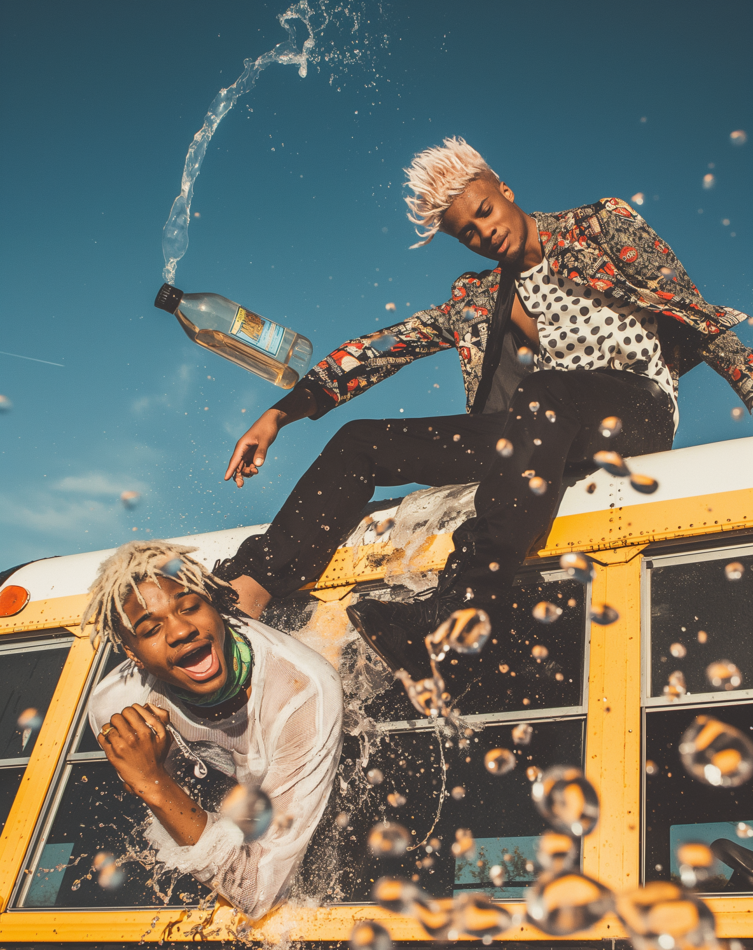 The image captures a vibrant moment on top of a school bus during sunny weather. Two young men share a joyful interaction, one pouring water while the other floats above, dressed in colorful attire.
