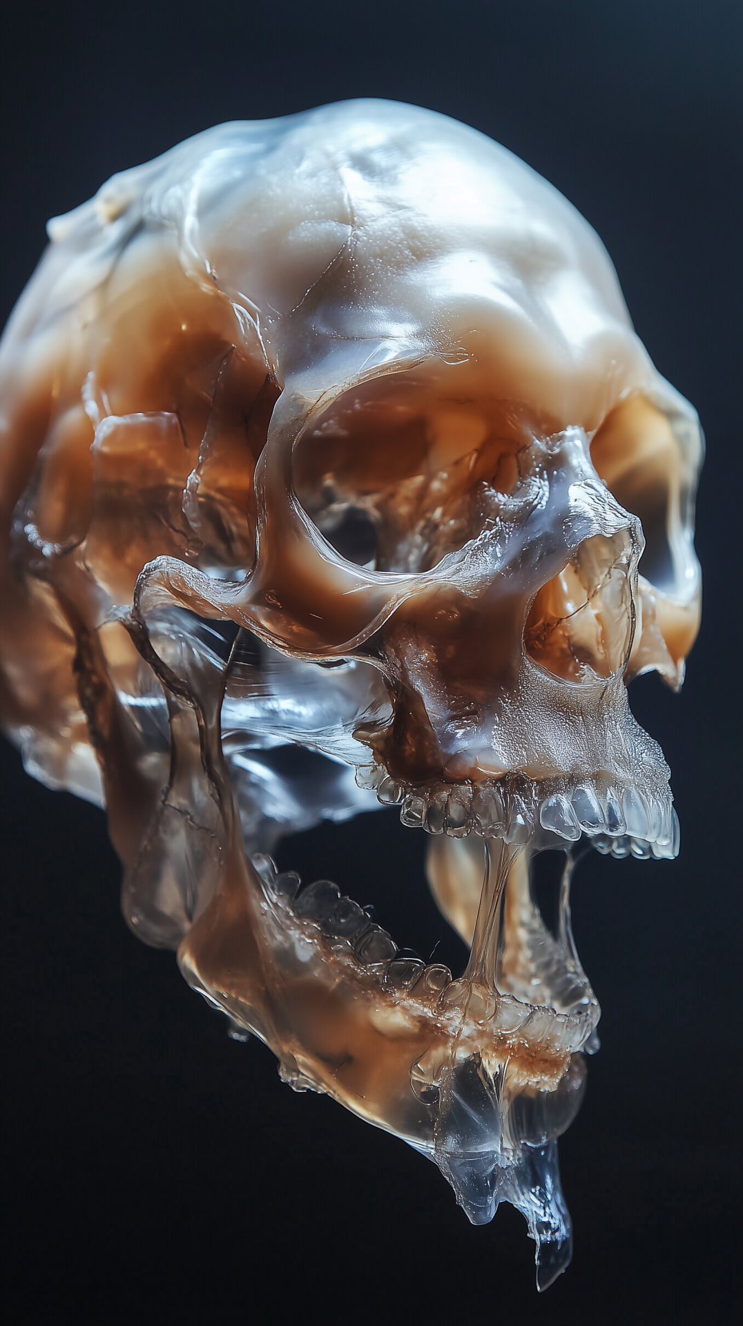 The image depicts a hyper-realistic human skull, some parts crafted from skin while others appear translucent as if made from thick gel. Set against a matte black background, the contrasting textures create a striking and eerie effect.