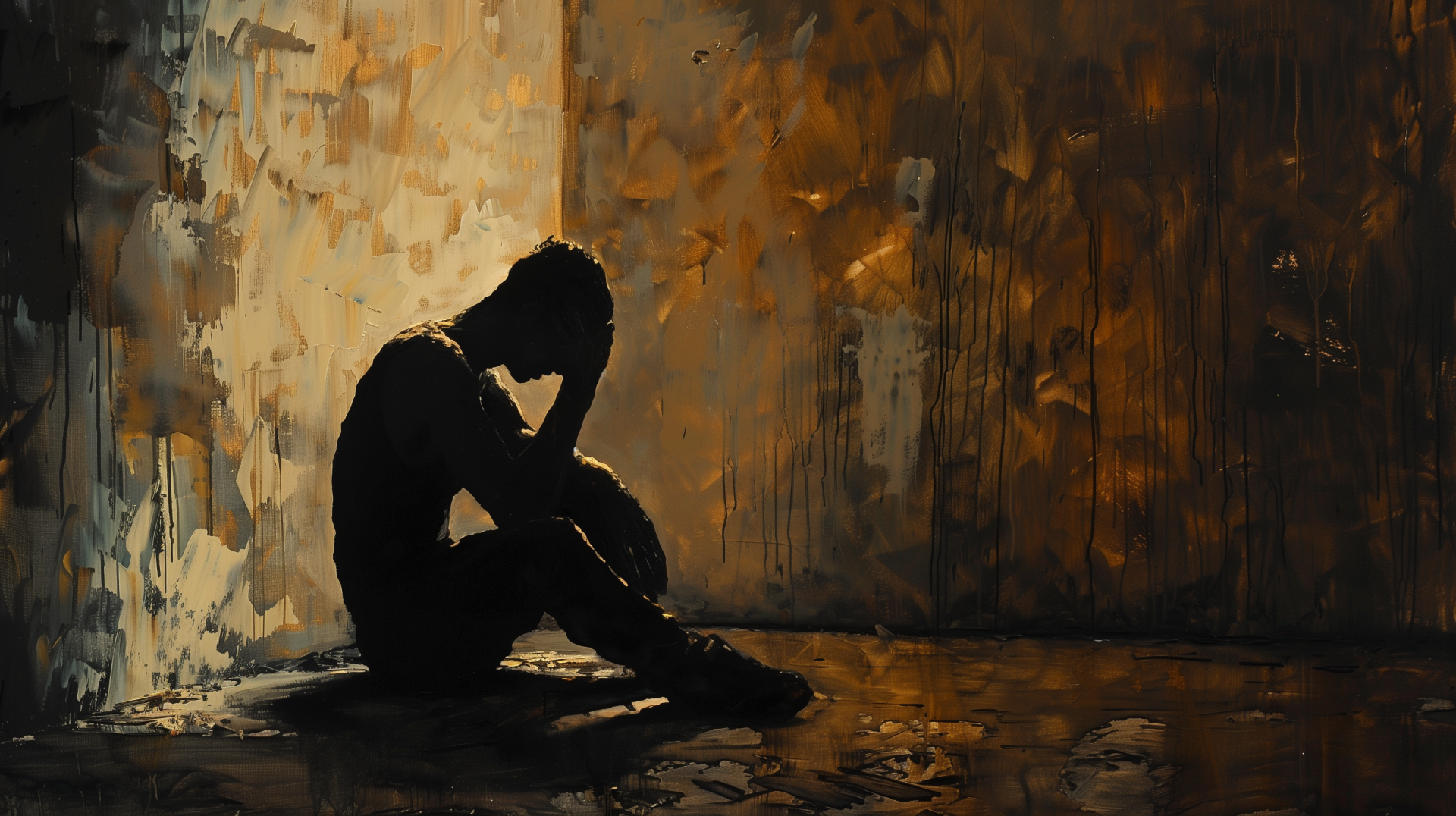 This oil painting depicts a lone man sitting in a dimly lit room, encapsulating a deep sense of sorrow. The silhouette effect creates an emotional atmosphere, emphasizing the man's feelings of despair and isolation.