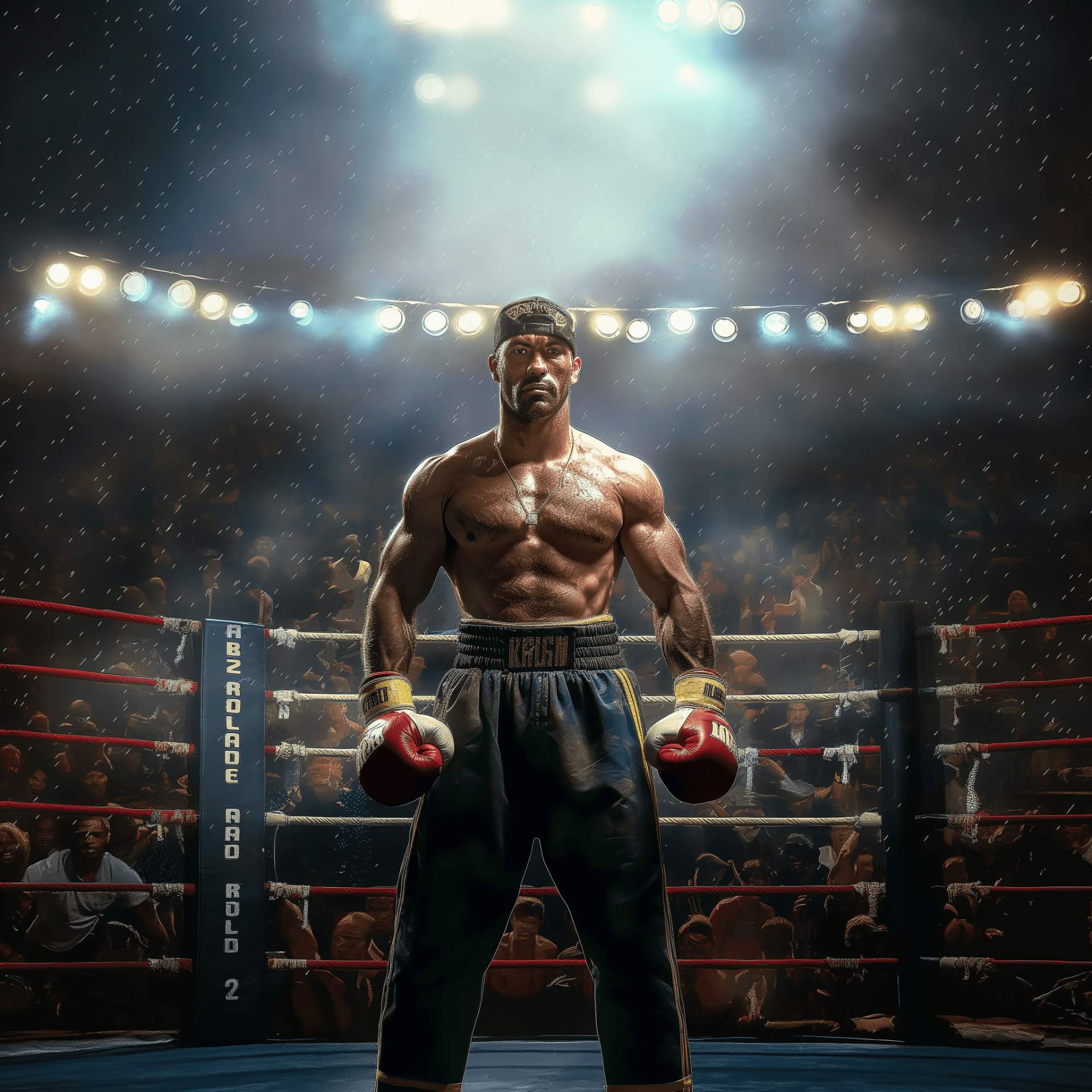 The image features a winning fighter displaying a confident stance, showcasing impressive muscles and a determined expression. Bright lights illuminate the scene, enhancing the realism and intensity of the moment.