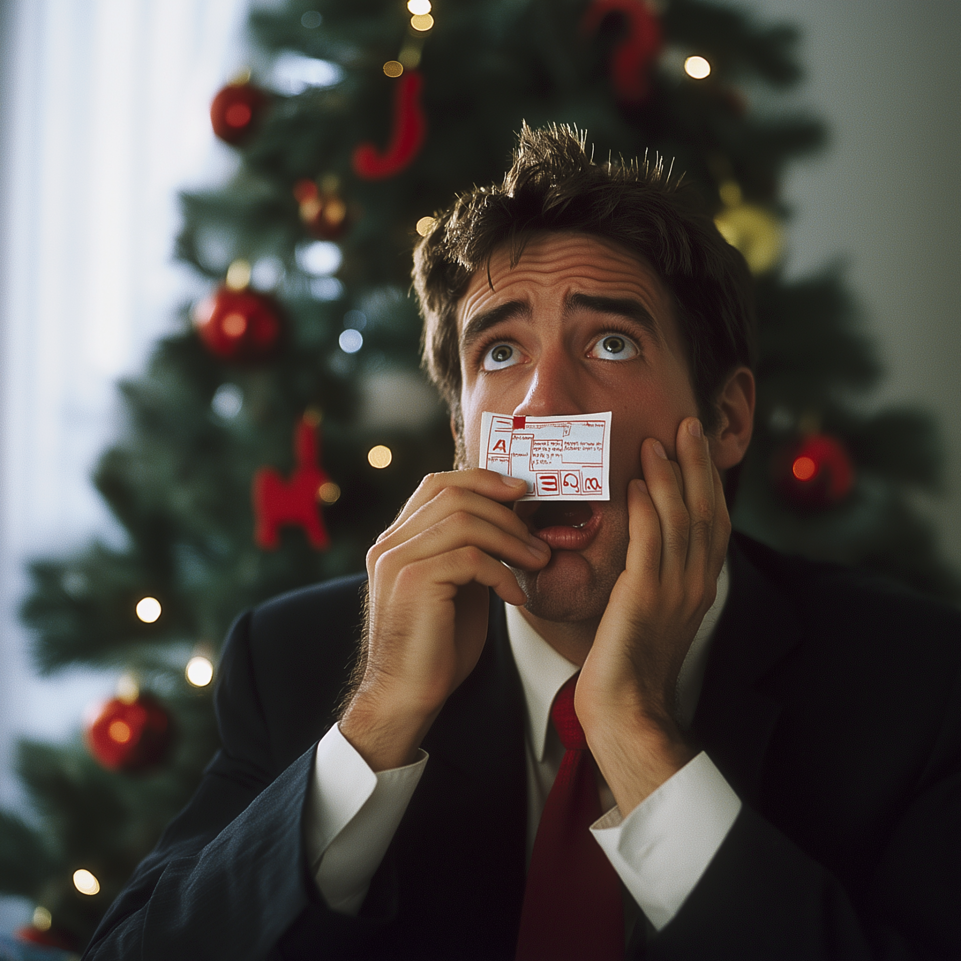 The image depicts a corporate professional with a distressed expression, holding a lottery ticket tightly in his hands. The background suggests an office setting, adding to the urgency of his situation as he realizes he has not prepared for Christmas.