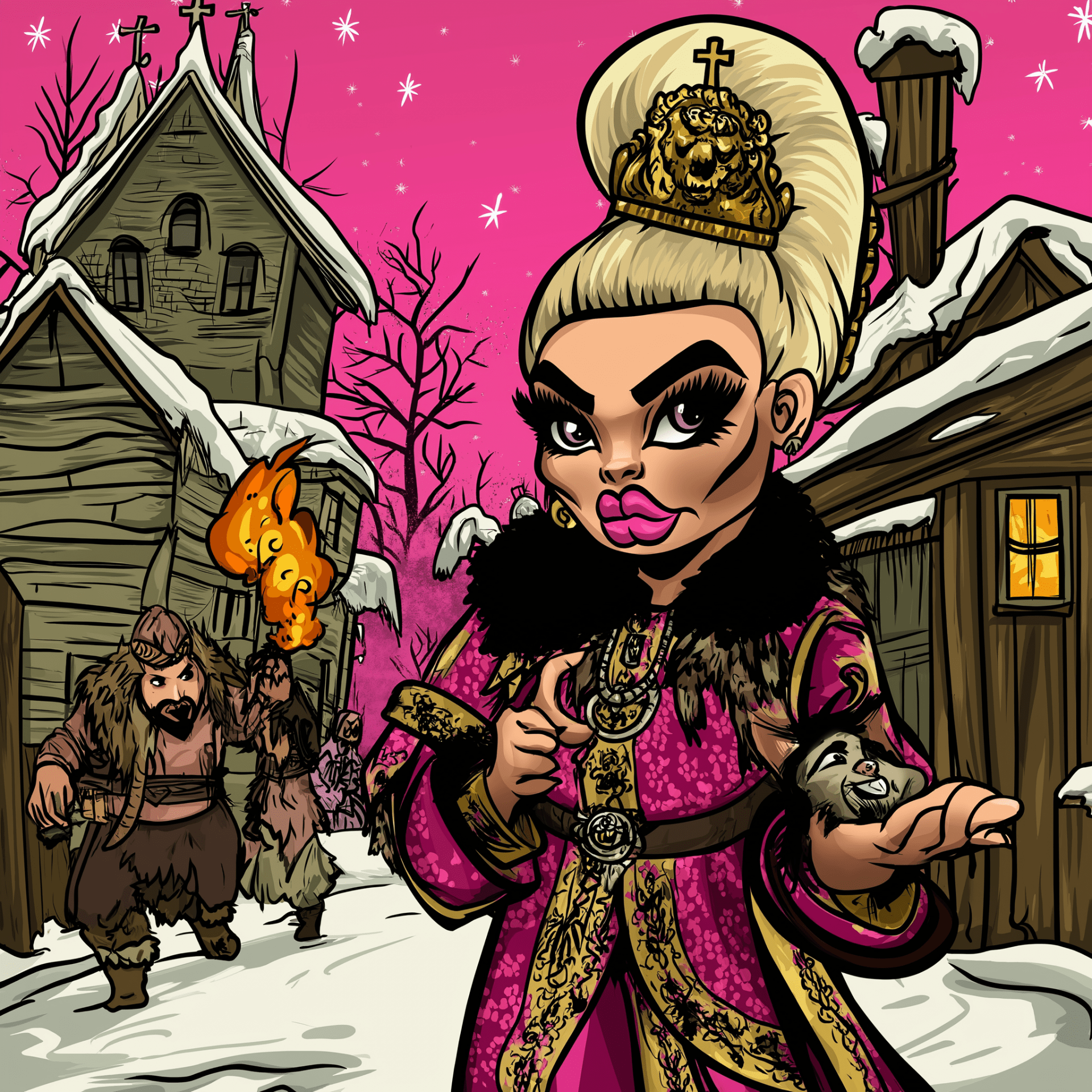 This illustration captures a dramatic nighttime scene in snowy Russia during the year 927 AD, where a church is engulfed in flames. The foreground depicts the Bishop in glorious robes and a holy fool engaging with the Vikings, creating a tense yet vivid atmosphere.