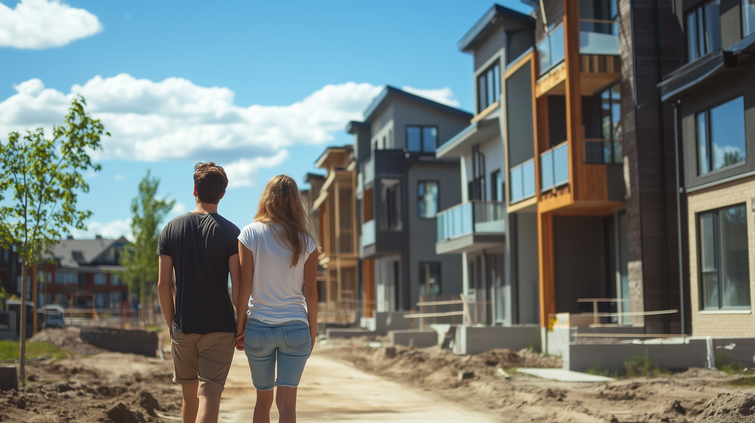 A couple is admiring a row of under-construction townhouses surrounded by summer greenery. The scene is vibrant and lively, capturing the excitement of new beginnings in a busy urban development.