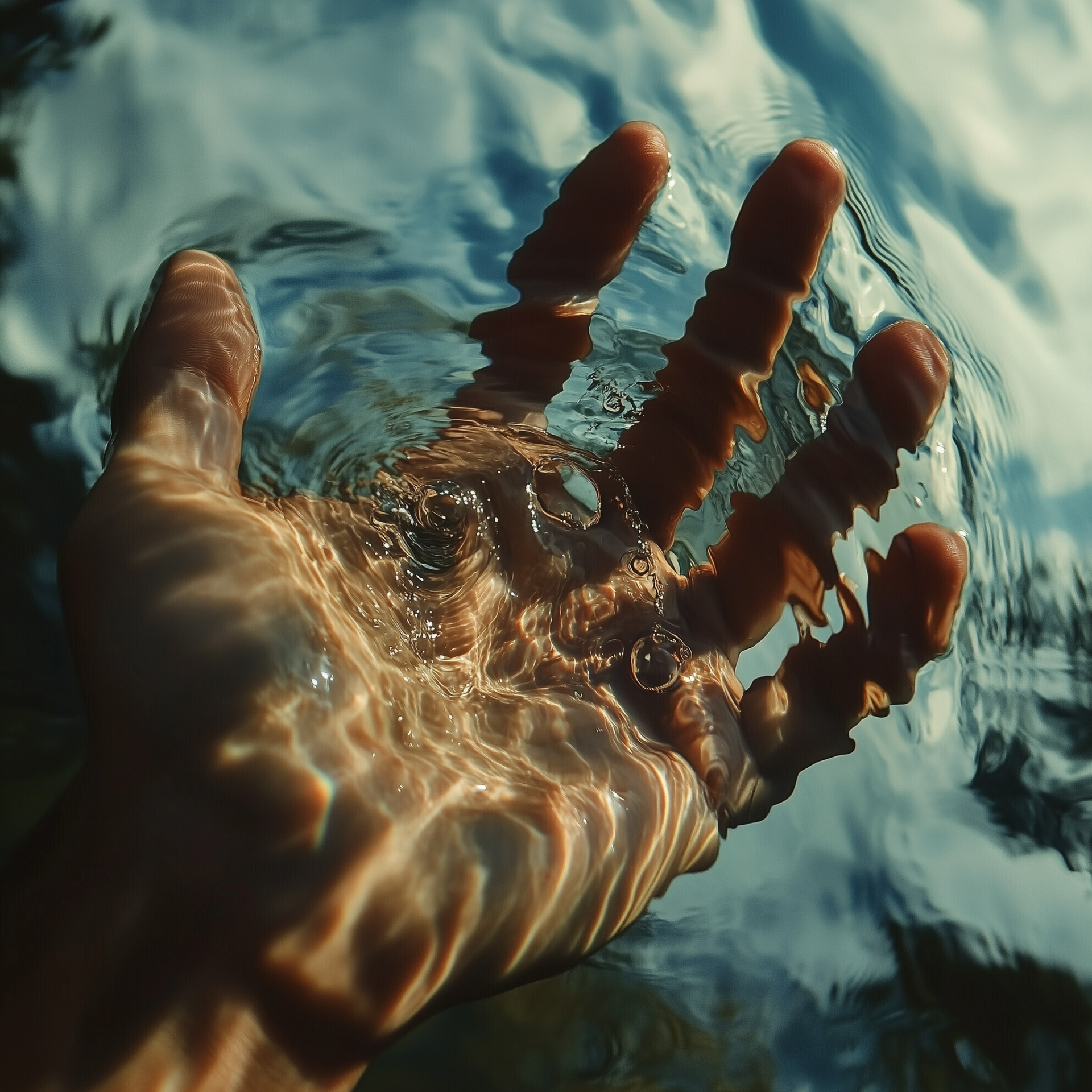 The image depicts a highly detailed reflection in a hand making a 'tchuss' gesture. The clarity of the reflection and the artistry of the hand create a striking visual effect.