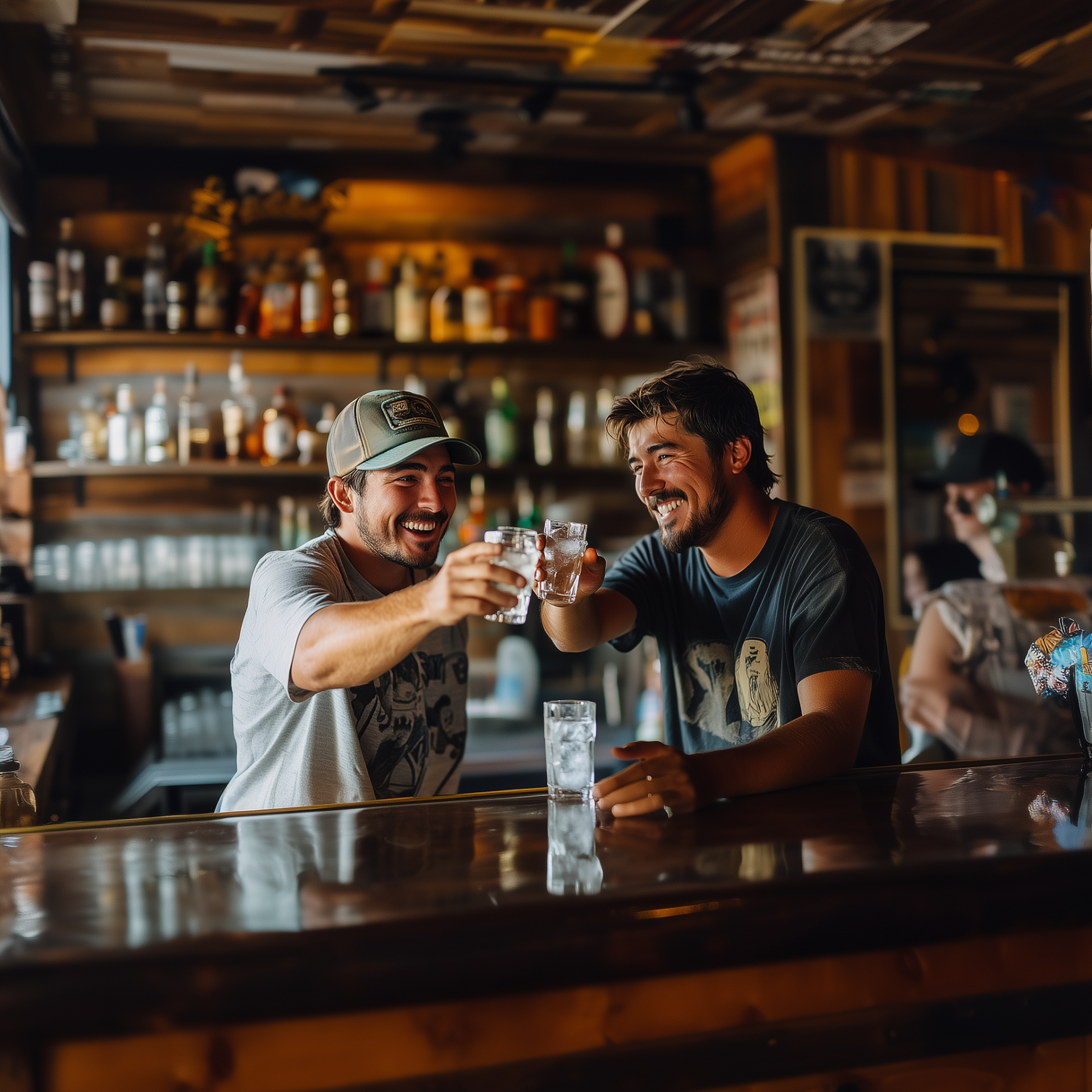 Two men share a moment of celebration in a lively bar, raising their vodka shot glasses in a toast. The setting is warm and inviting, with a sense of camaraderie and enjoyment in the air.