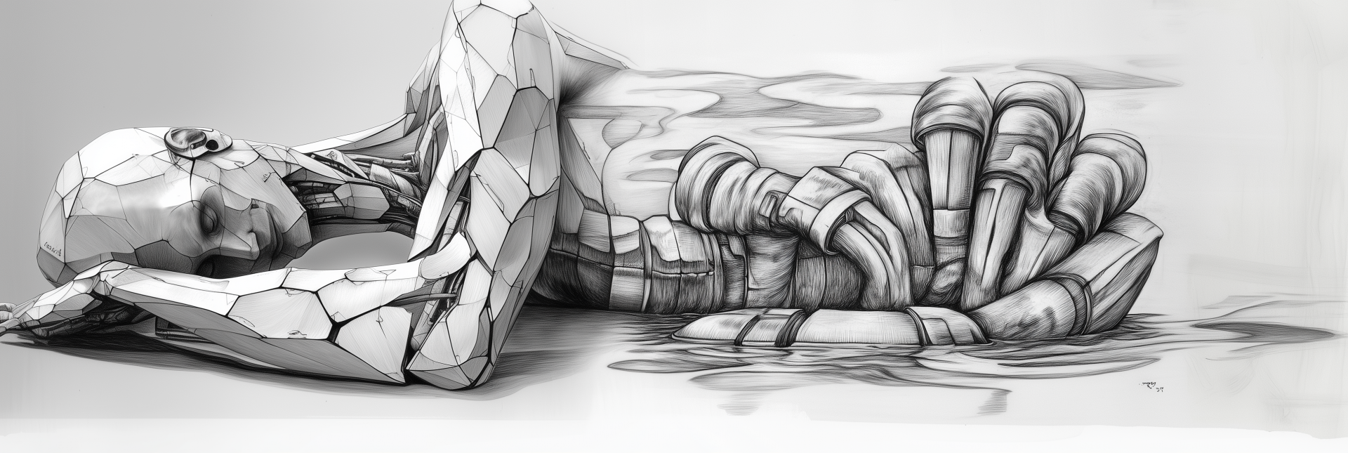 The image depicts a broken android amidst a vast and desolate landscape, conveying a sense of abandonment and loneliness. The surroundings are barren, enhancing the feeling of isolation in a futuristic setting.