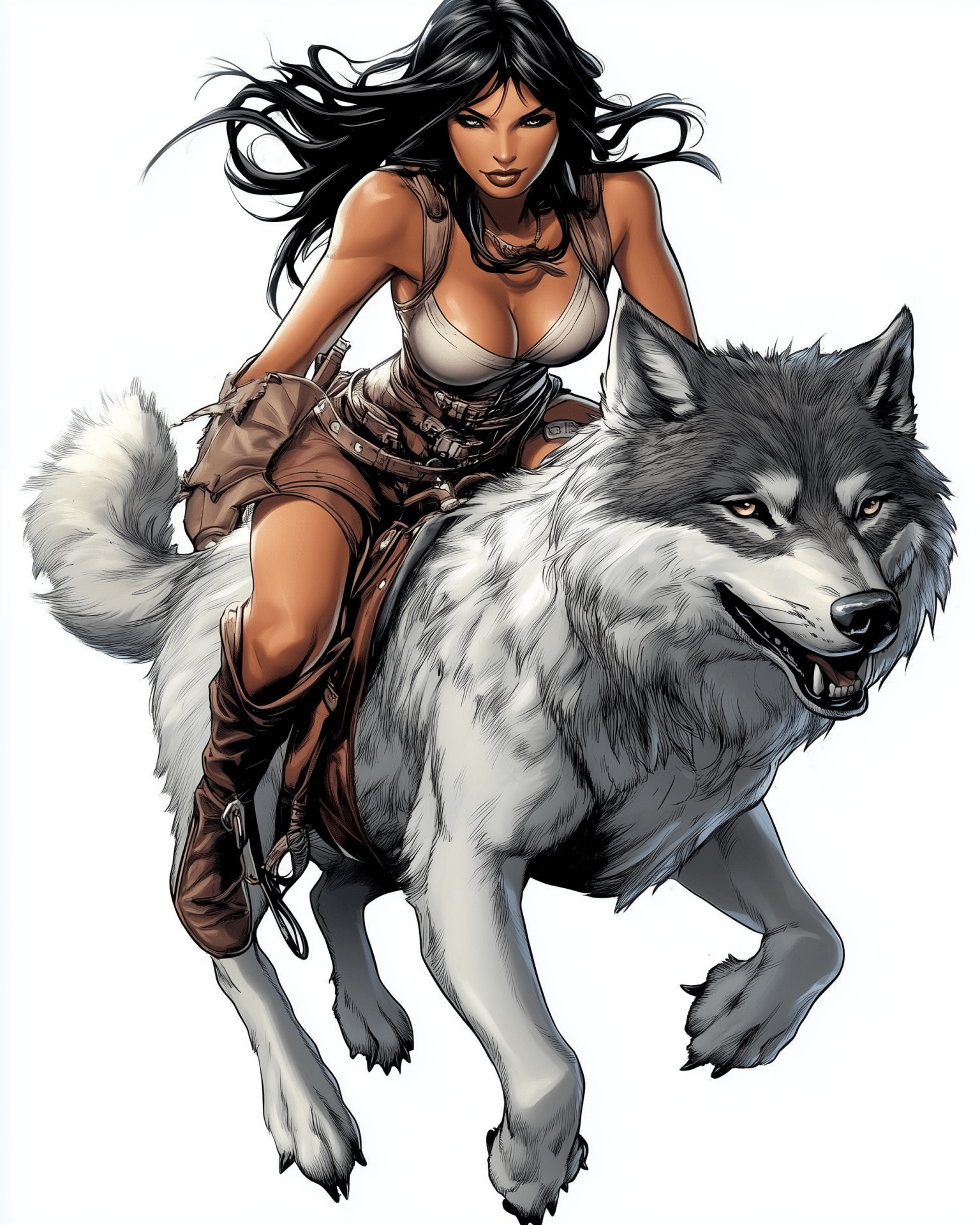 This illustration features a striking woman confidently riding a majestic wolf. The art style is reminiscent of classic comic book aesthetics, showcasing bold colors and dynamic poses against a clean white background.